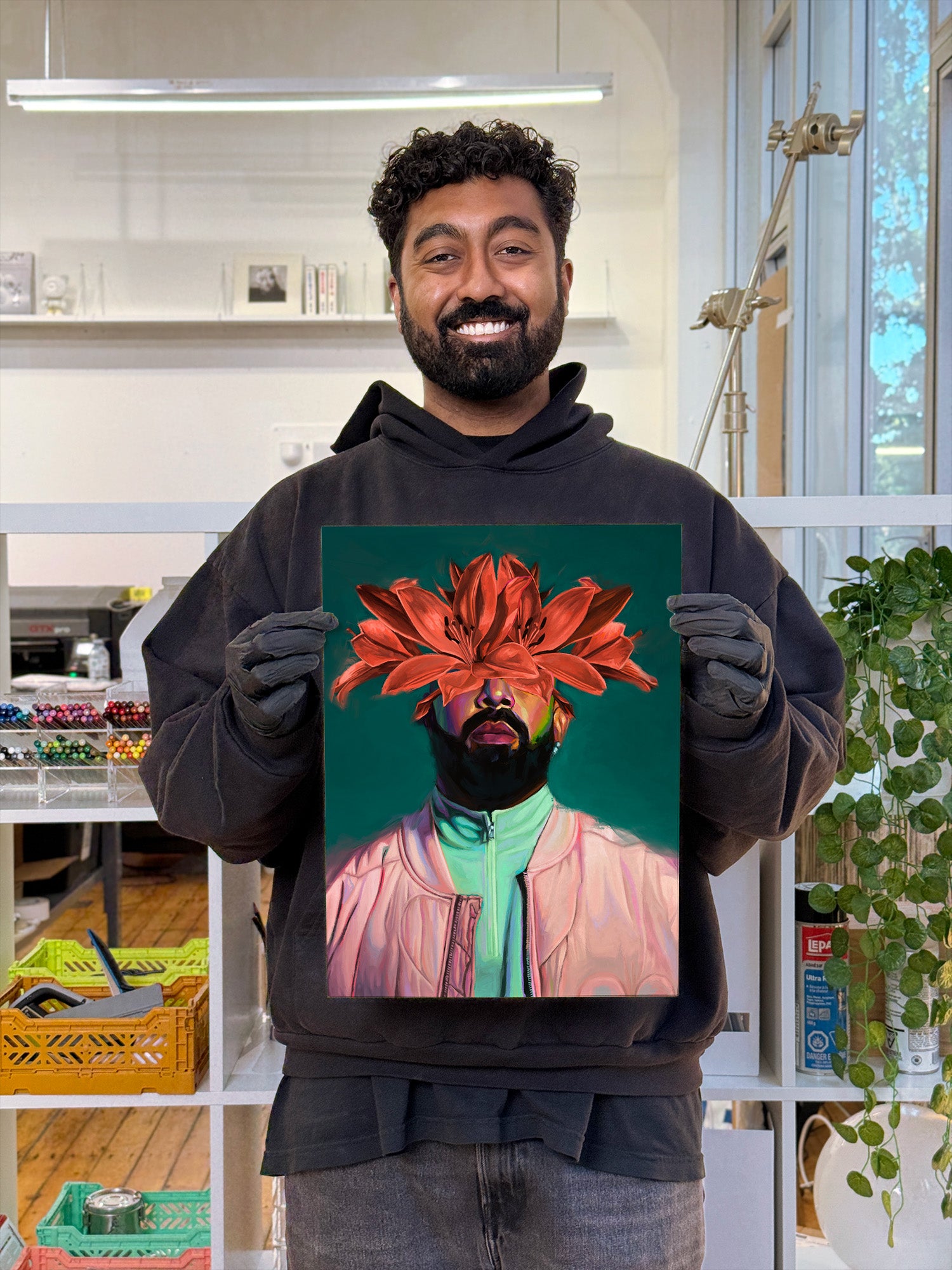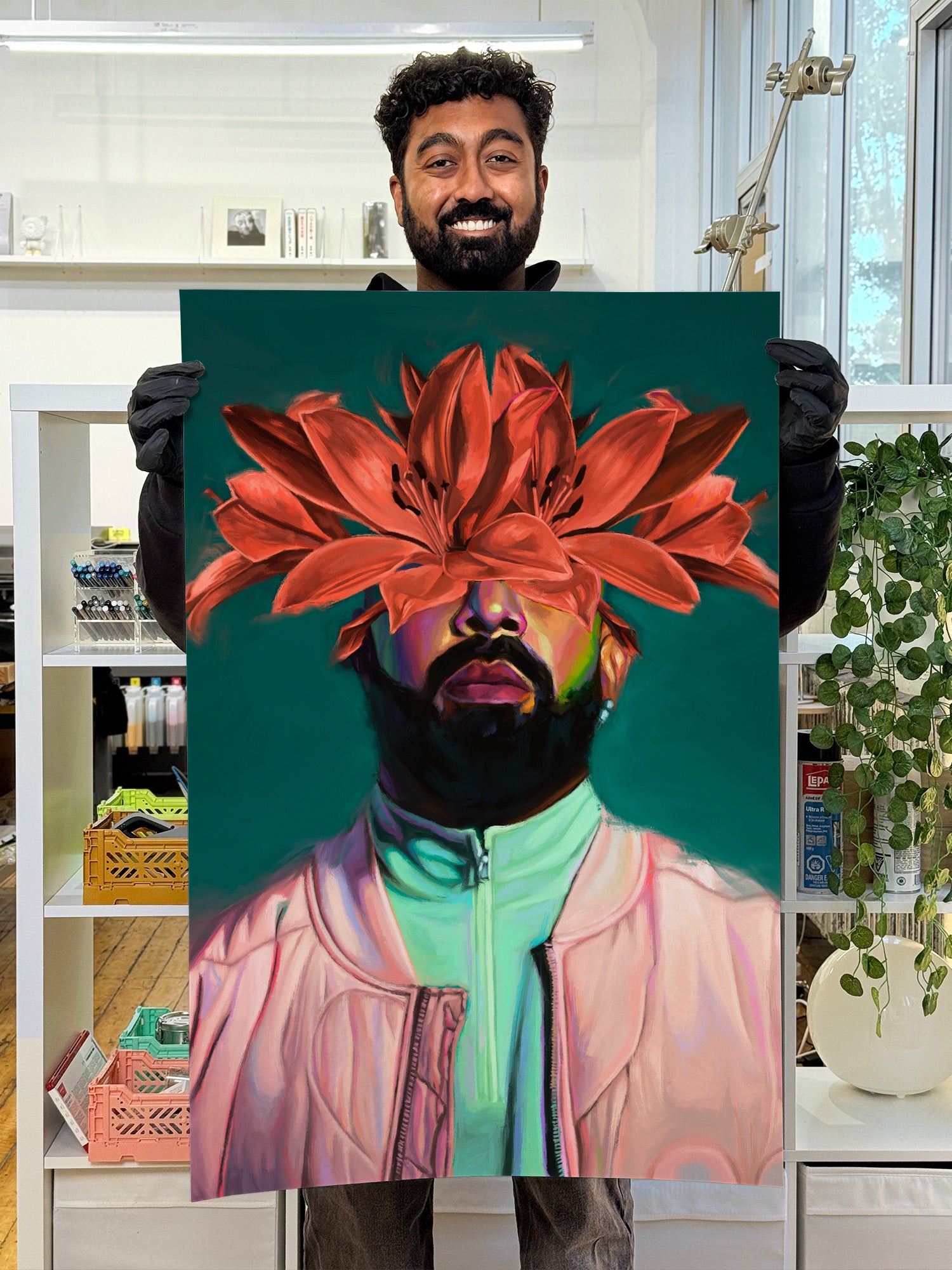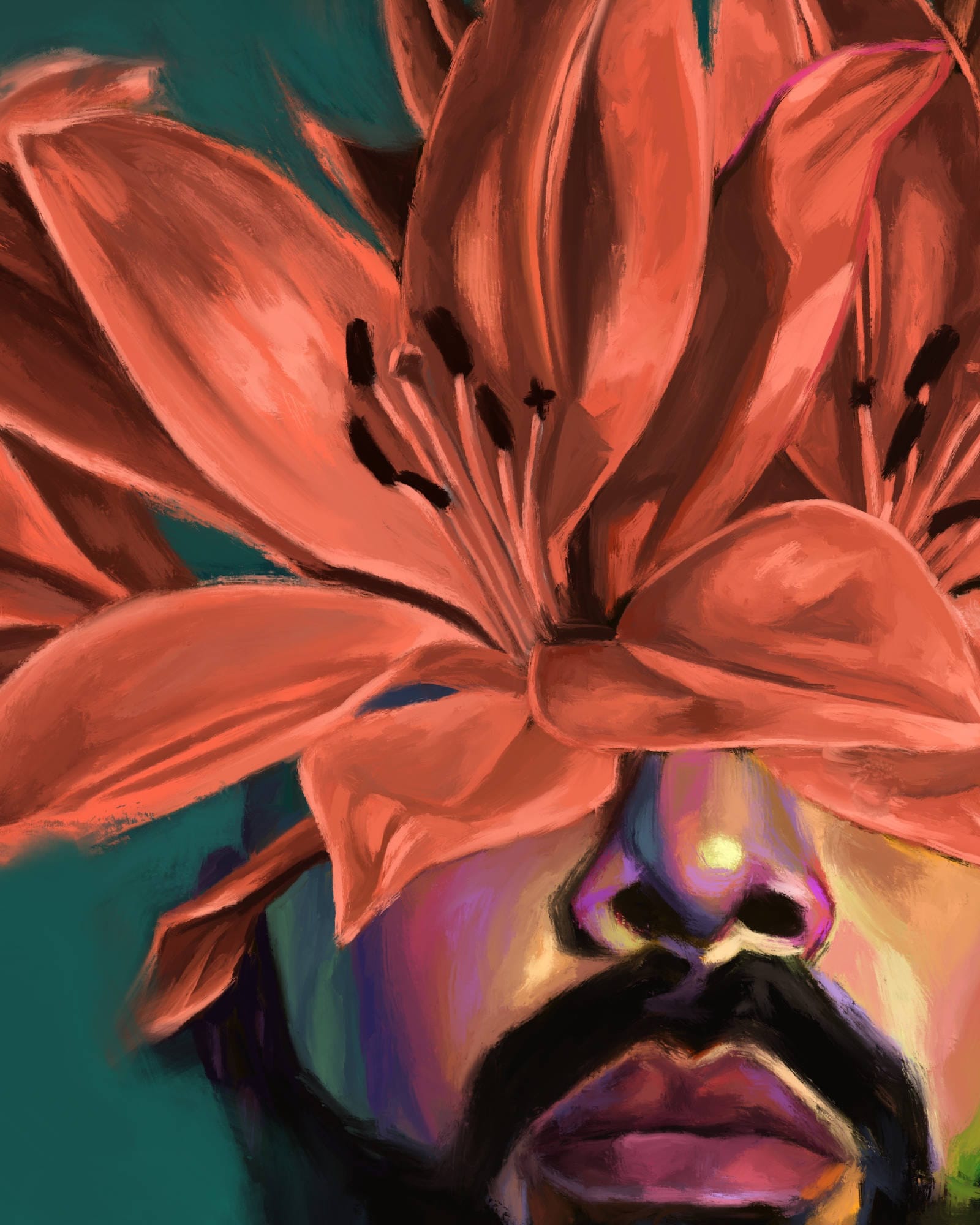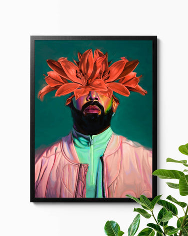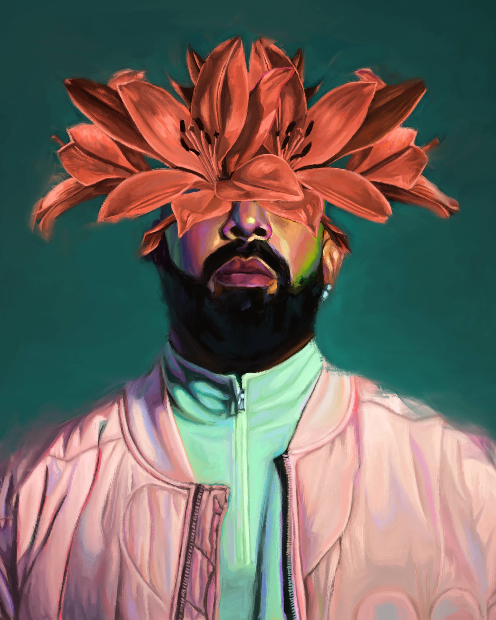 I painted this piece in anticipation of the Certified Lover Boy album. It was an exercise of detail to capture the intricacies on his jacket and sweater. Capturing the materiality of his garments was challenging, but I learned a lot from observing the nuances of light while painting it. The exploration of colour was inspired by the Certified Lover Boy music video, and I tried to push some of the tones in his skin to push my understanding of chroma. The flower adornment was purely an aesthetic choice but I did choose lotus flowers as the flowers of choice because they vaguely resemble owl’s wings to me.