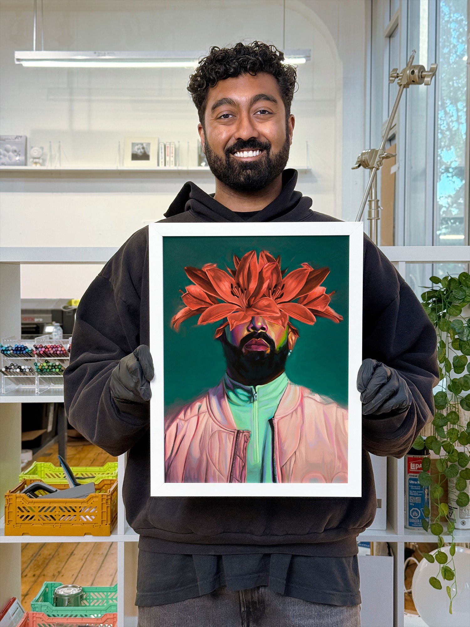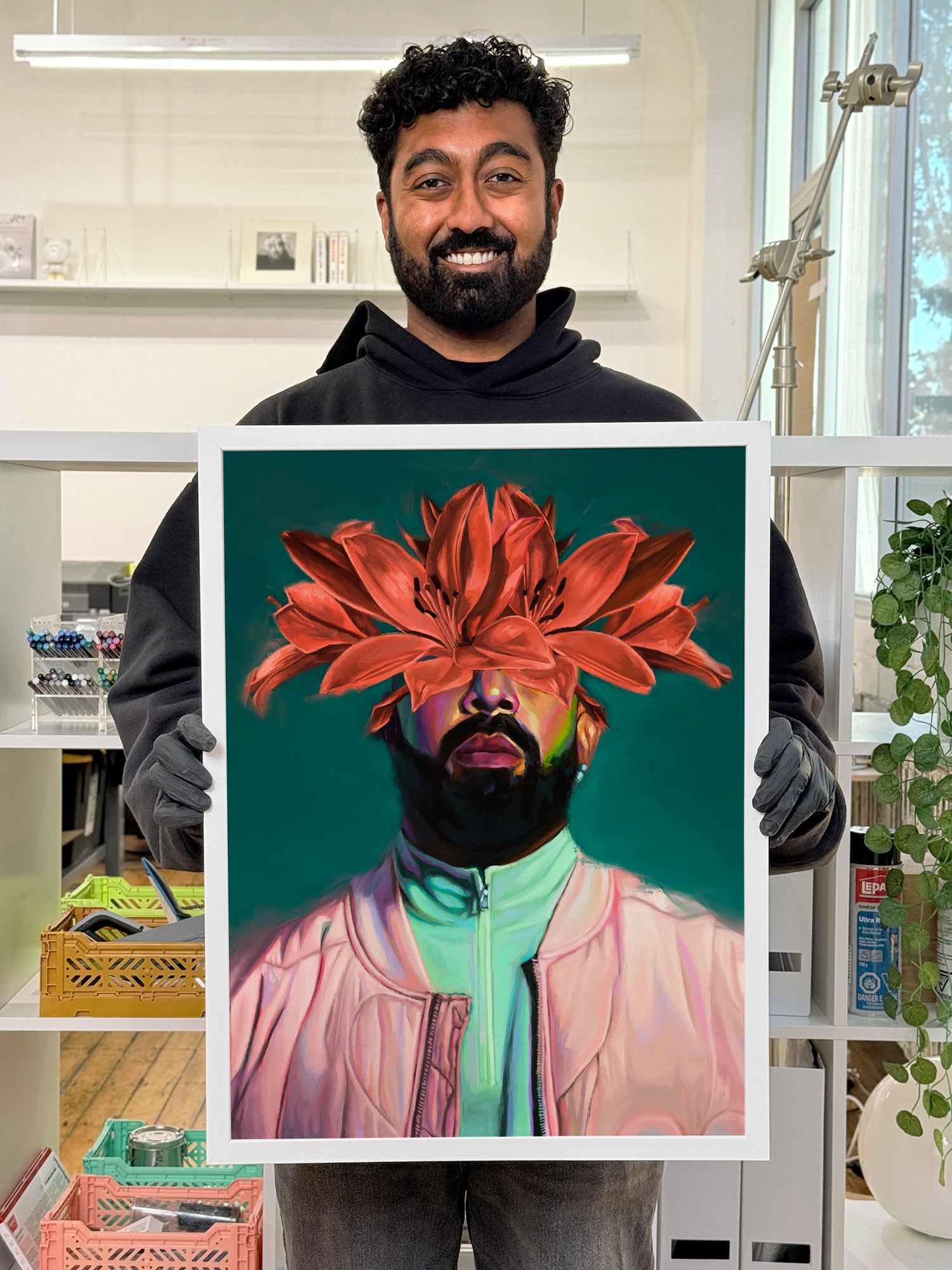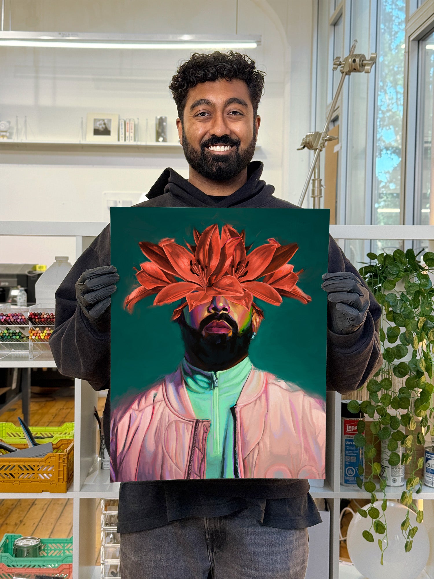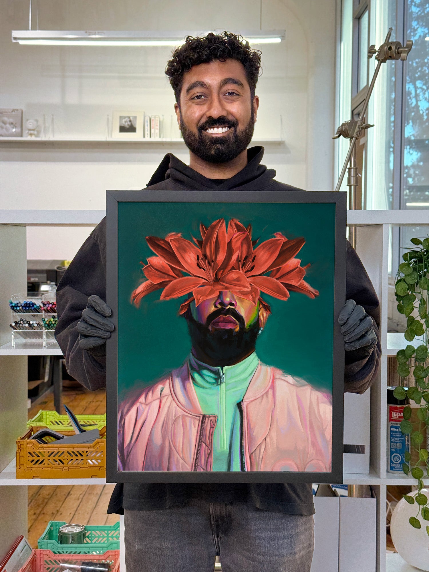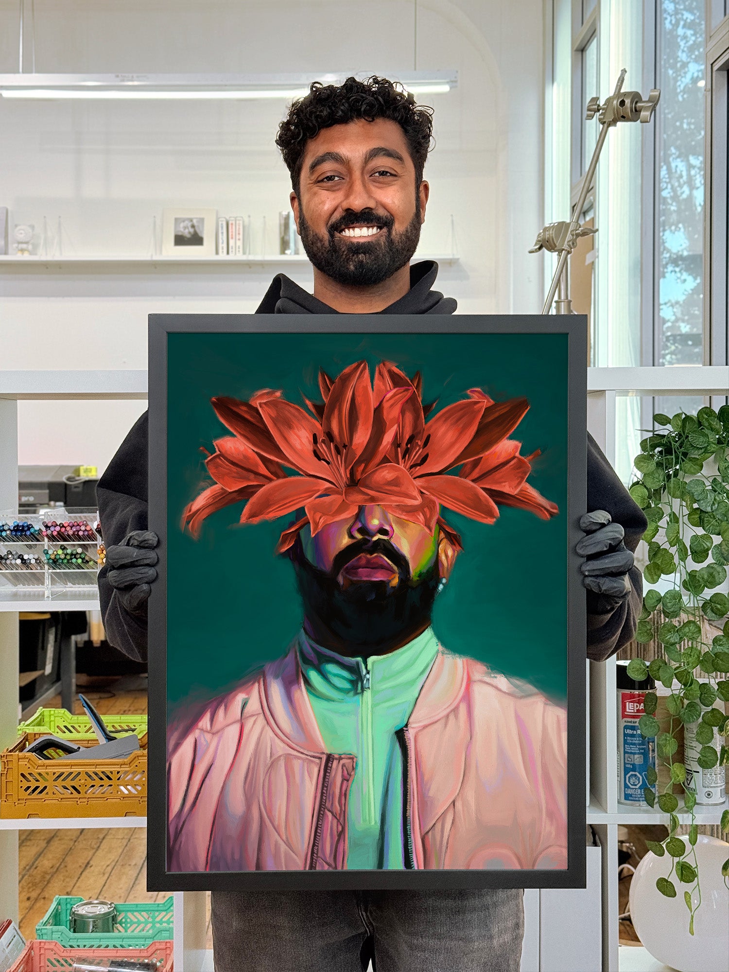 I painted this piece in anticipation of the Certified Lover Boy album. It was an exercise of detail to capture the intricacies on his jacket and sweater. Capturing the materiality of his garments was challenging, but I learned a lot from observing the nuances of light while painting it. The exploration of colour was inspired by the Certified Lover Boy music video, and I tried to push some of the tones in his skin to push my understanding of chroma. The flower adornment was purely an aesthetic choice but I did choose lotus flowers as the flowers of choice because they vaguely resemble owl’s wings to me.