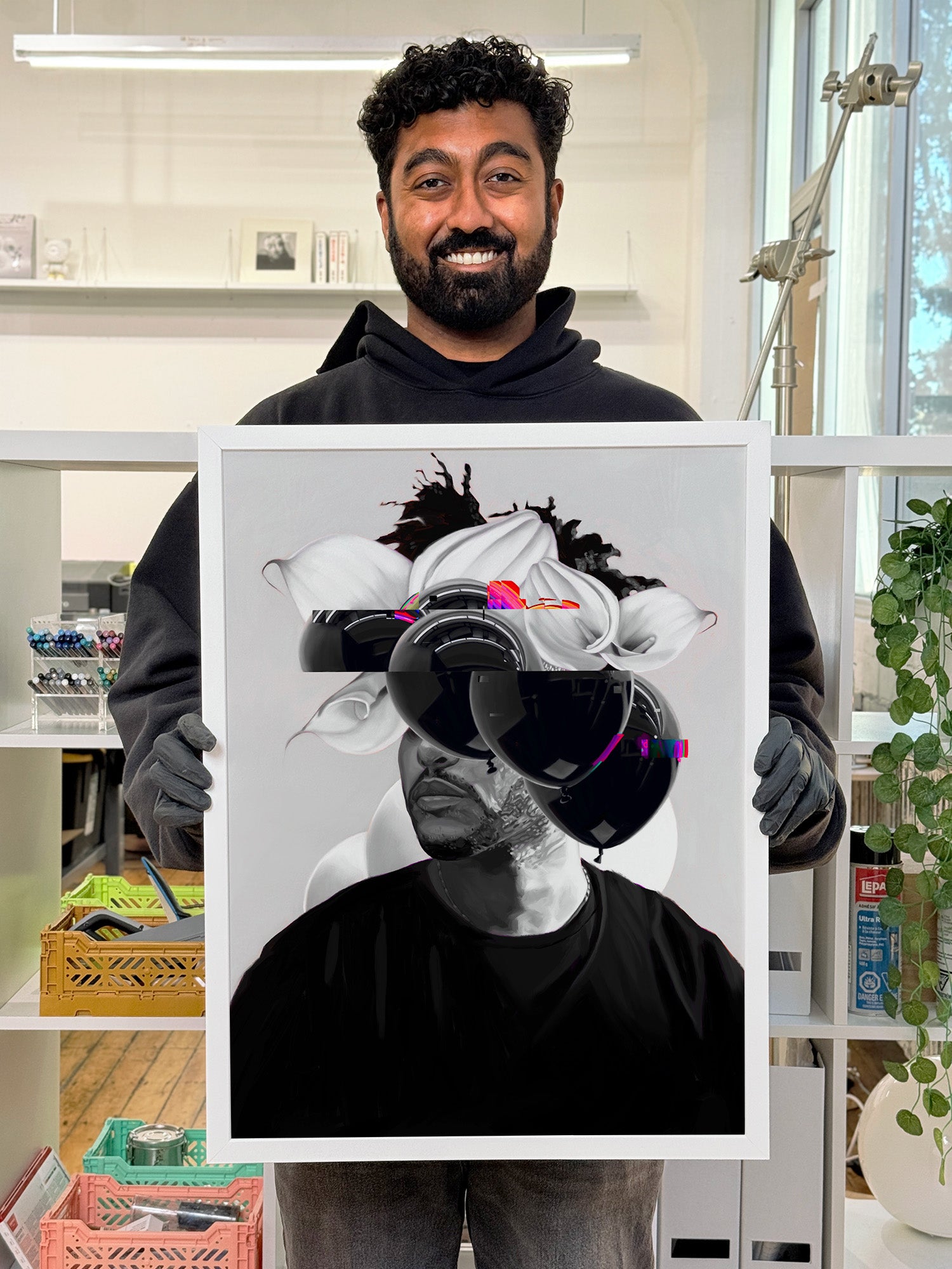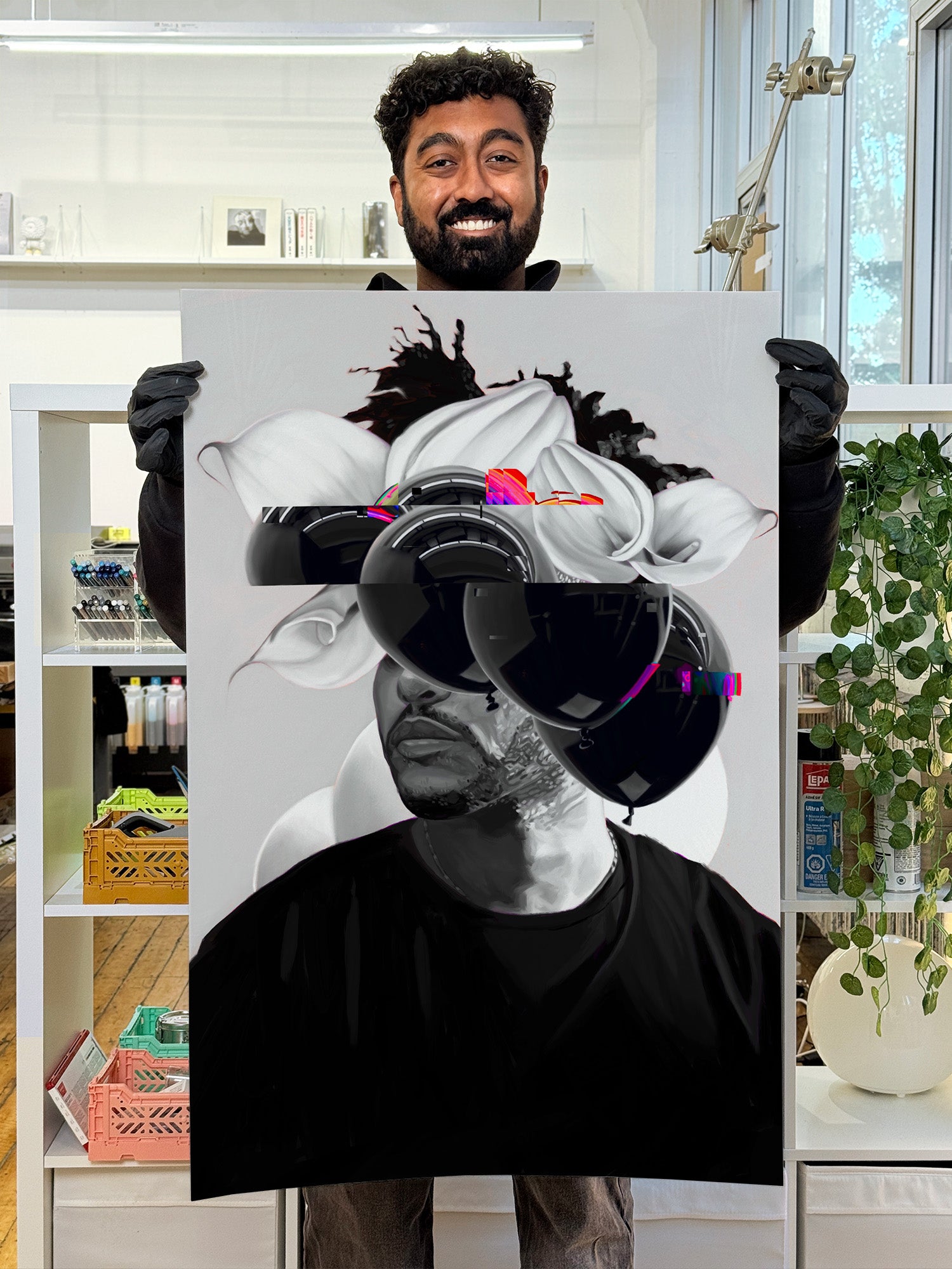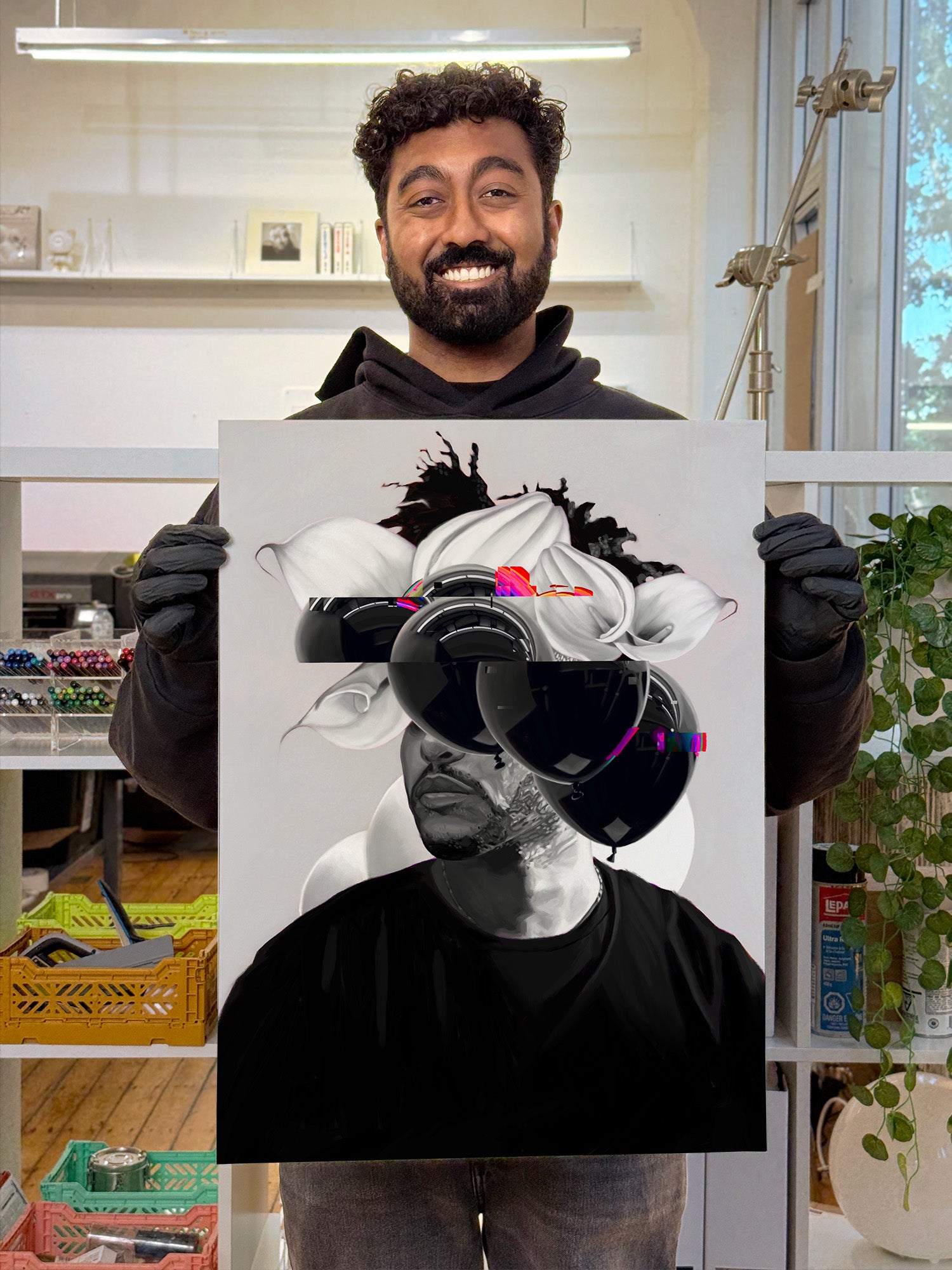 The glitch effect on the balloons made sense as a translation of this sound sensation into a visual experience. It helped compositionally too by balancing the blacks more evenly on the top, and by revealing the smaller flower.