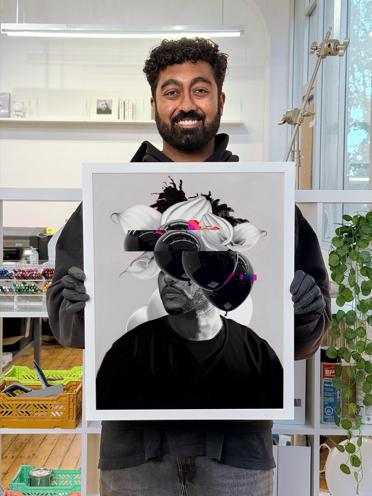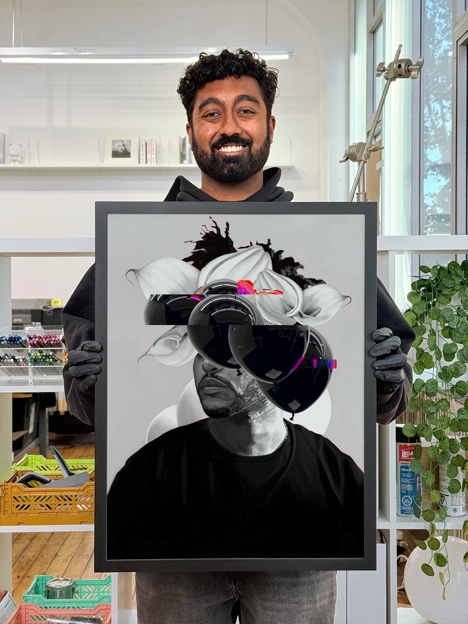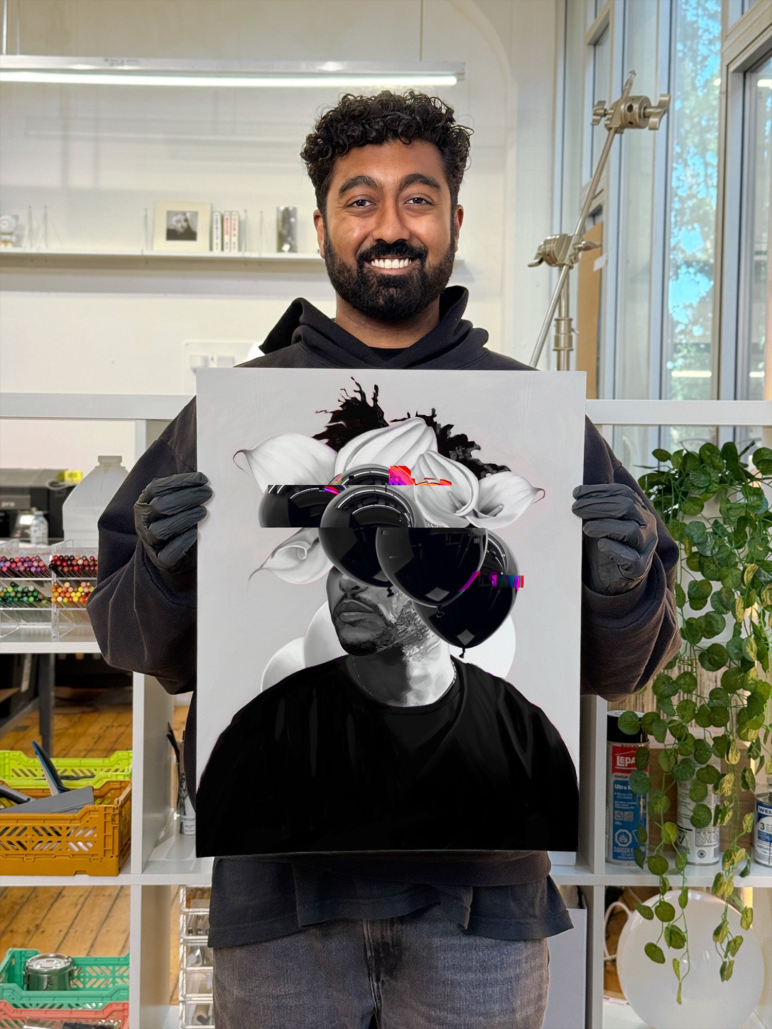 The glitch effect on the balloons made sense as a translation of this sound sensation into a visual experience. It helped compositionally too by balancing the blacks more evenly on the top, and by revealing the smaller flower.