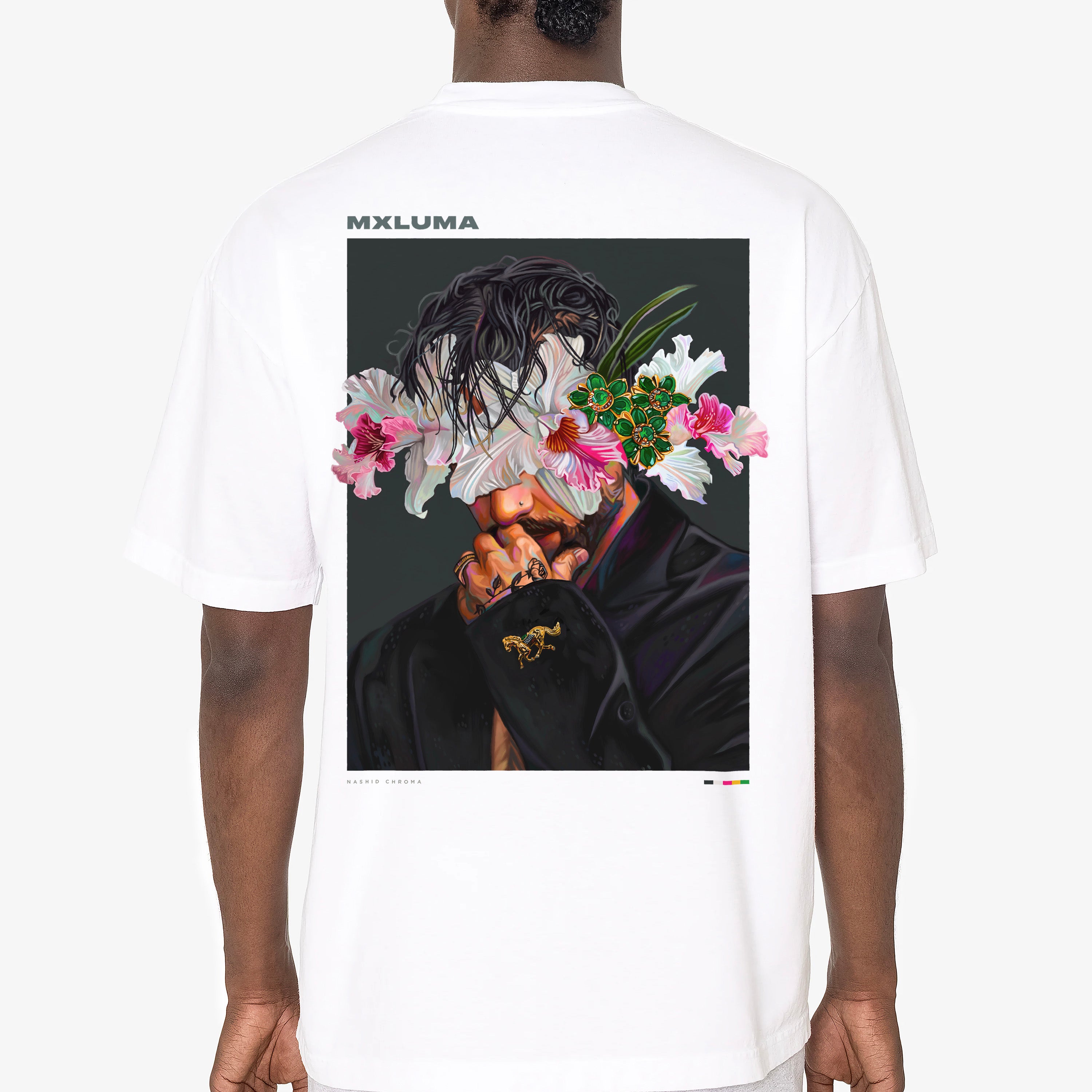 The piece is embellished with a premium silicone Nashid Chroma logo on the front, and an oversized "borderless" print of MXLUMA on the back. The size makes for an impressive statement piece in contrast to clean tee.