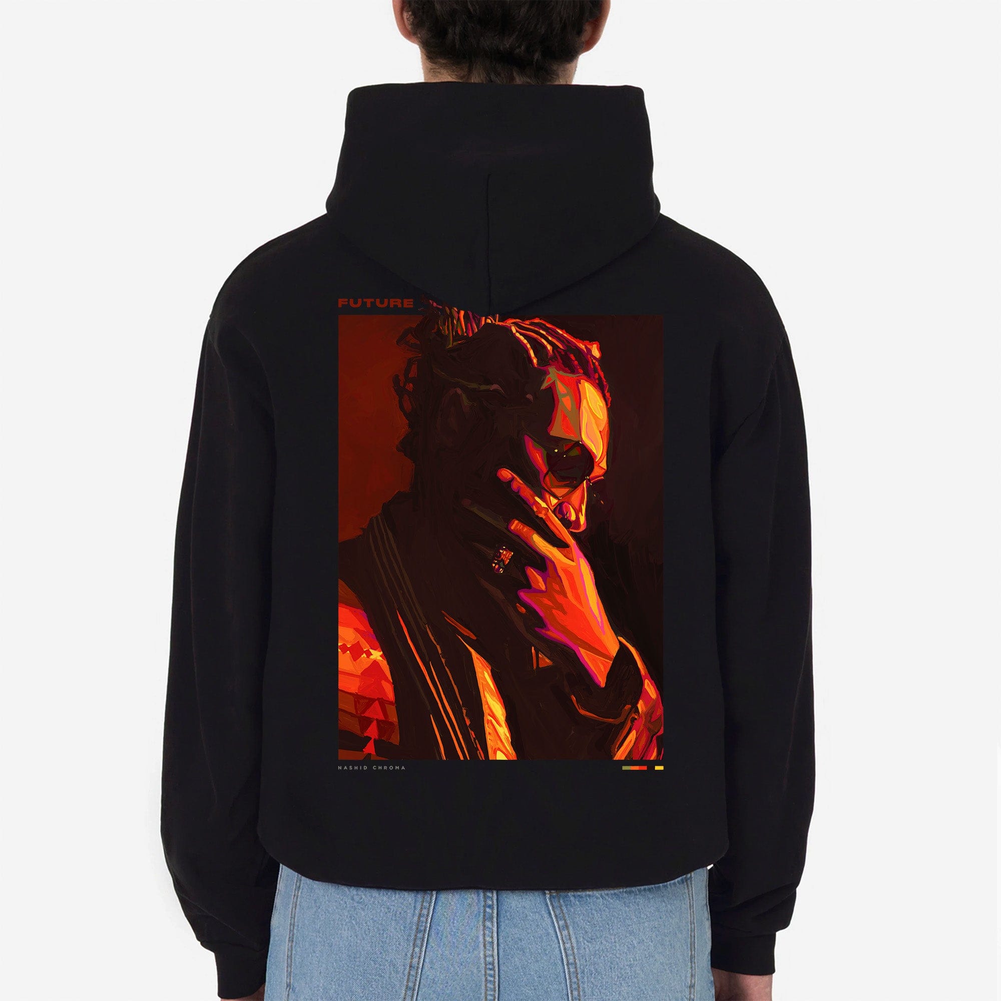 The piece is embellished with a premium silicone Nashid Chroma logo on the front, and an oversized print on the back. The size makes for an impressive statement piece in contrast to the crisp black cotton.