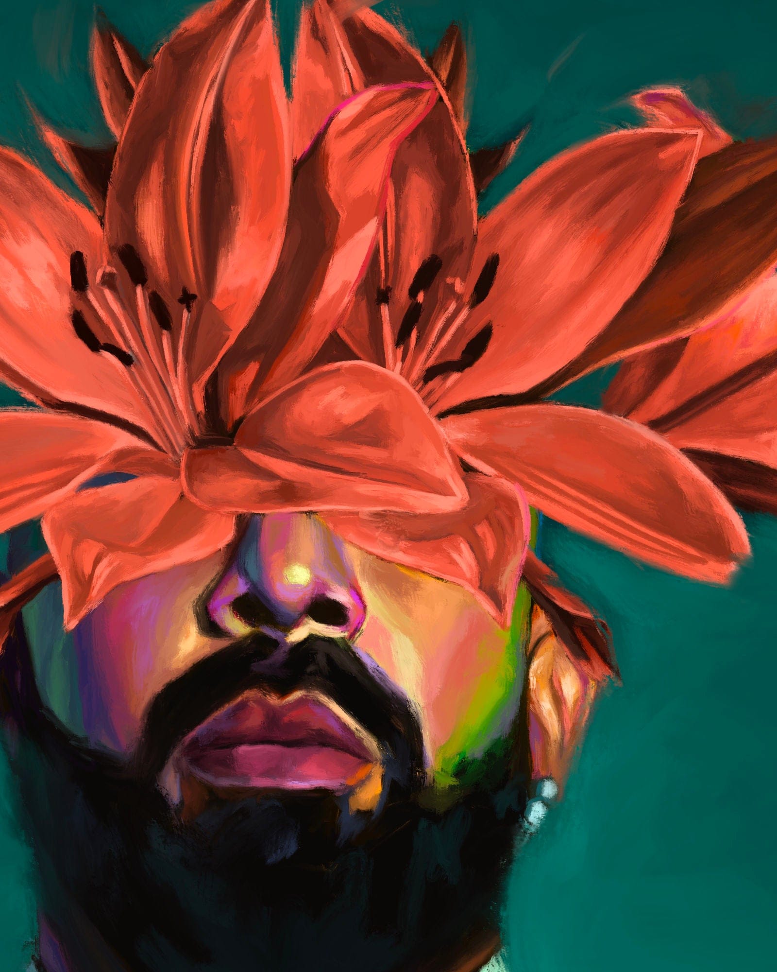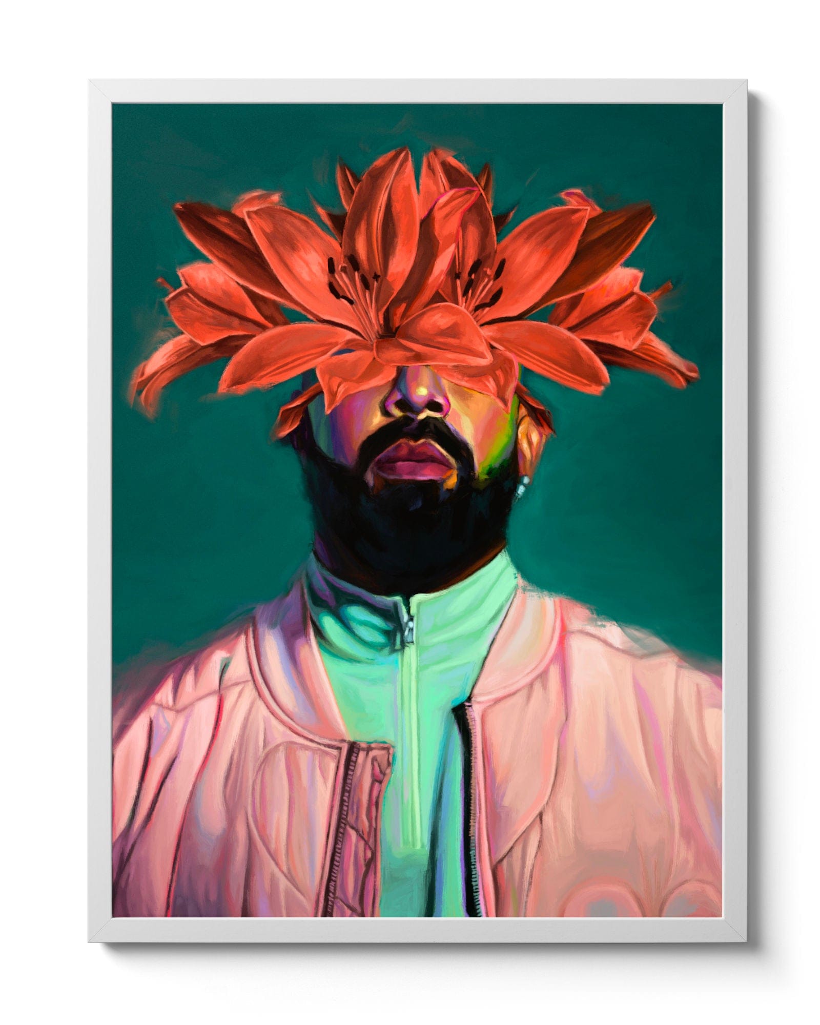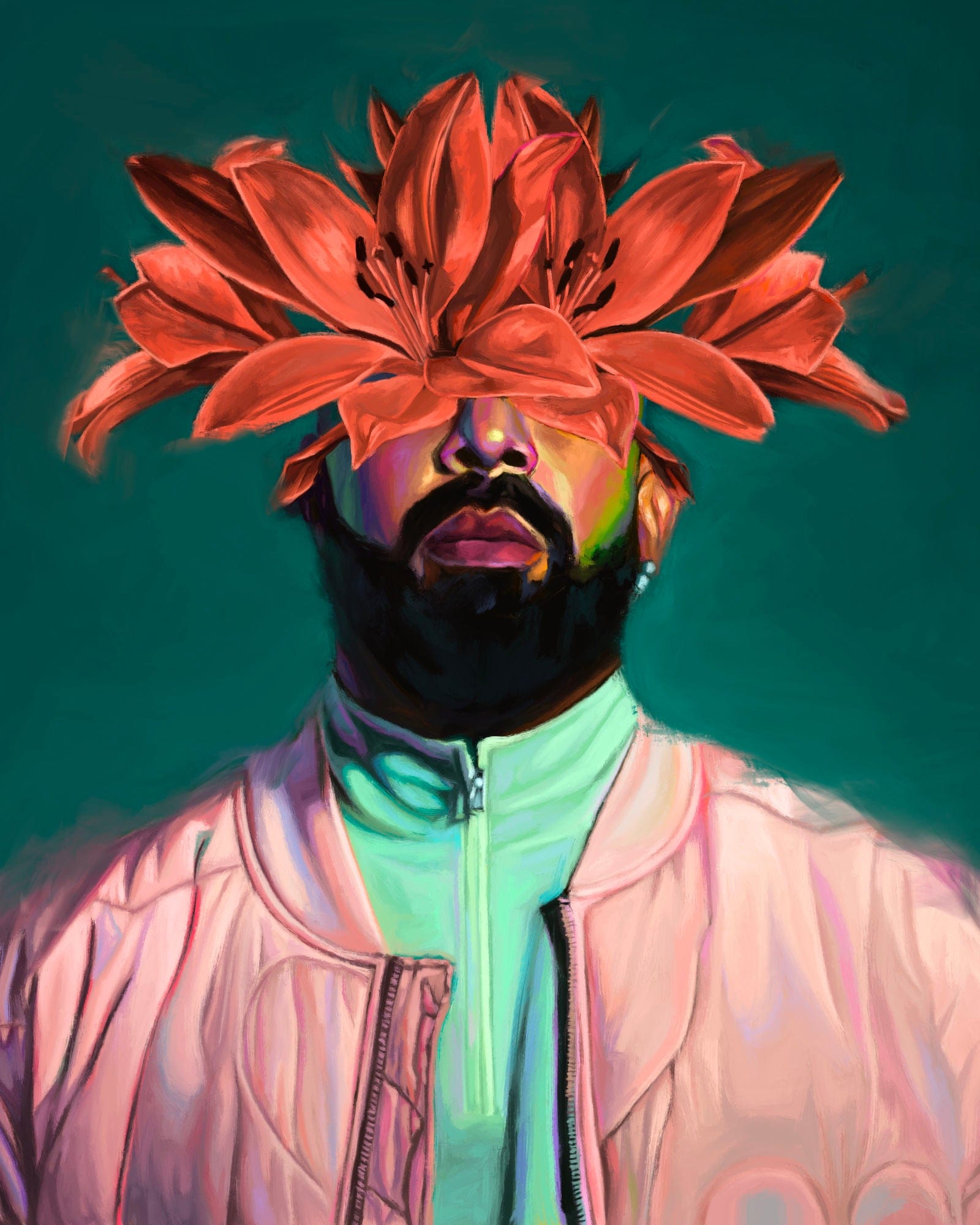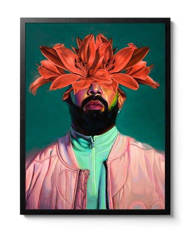 I painted this piece in anticipation of the Certified Lover Boy album. It was an exercise of detail to capture the intricacies on his jacket and sweater. Capturing the materiality of his garments was challenging, but I learned a lot from observing the nuances of light while painting it. The exploration of colour was inspired by the Certified Lover Boy music video, and I tried to push some of the tones in his skin to push my understanding of chroma. The flower adornment was purely an aesthetic choice but I did choose lotus flowers as the flowers of choice because they vaguely resemble owl’s wings to me.