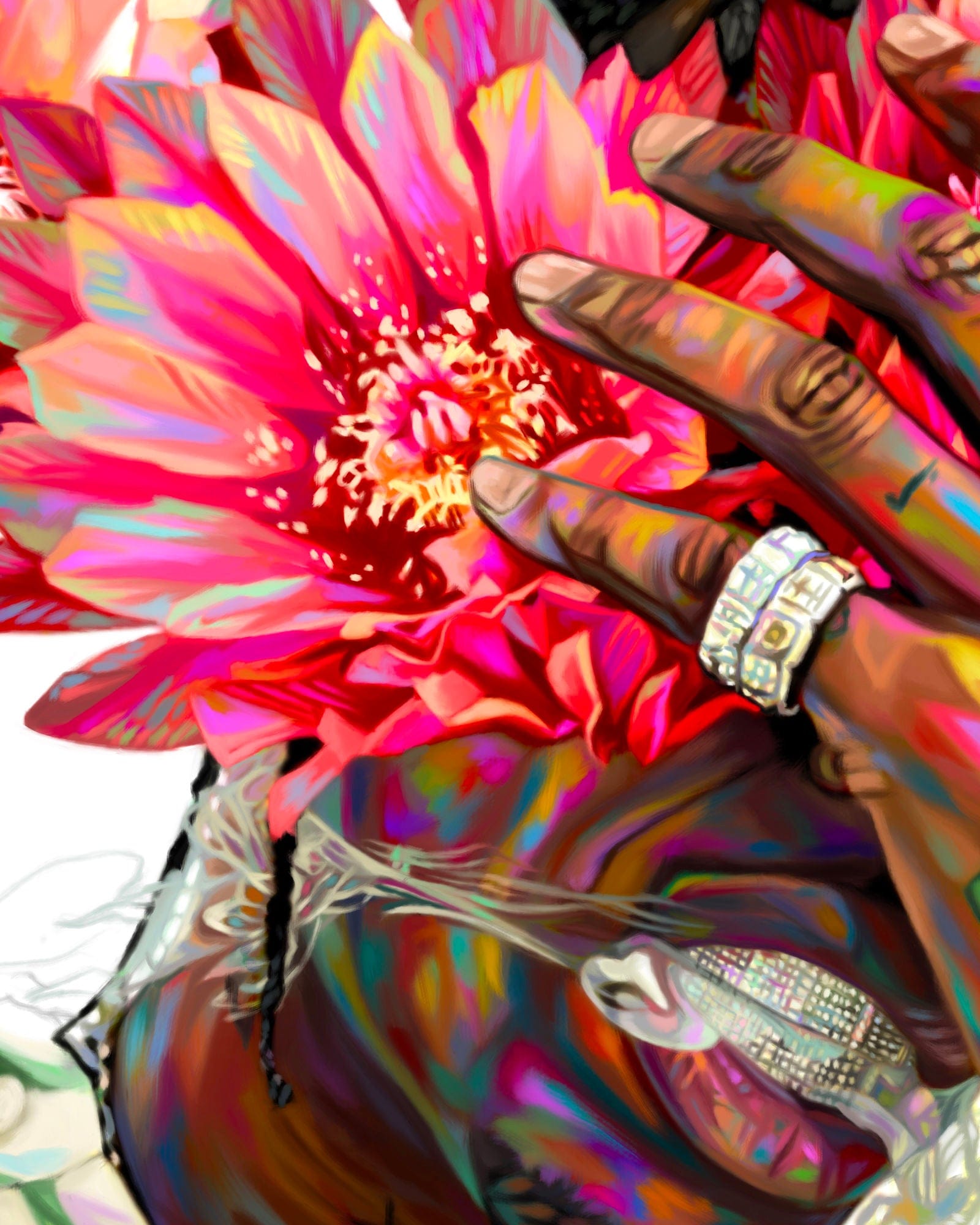 But was it worth it? Hell yeah. His hand is one of my favorite moments in the piece. Whenever I paint hands masking the flowers that mask the face, I get super excited. There are so many interesting shapes that dance in such a concentrated focal point and to me, that is exquisitely beautiful! 🤍