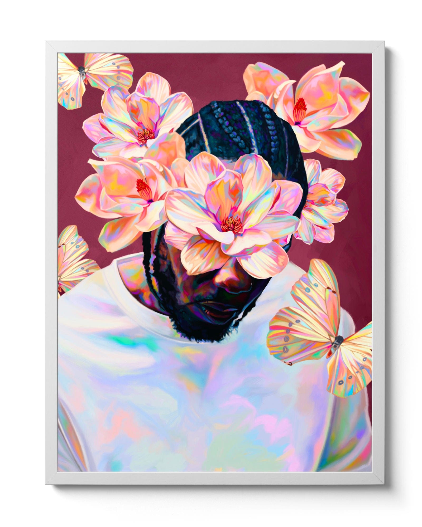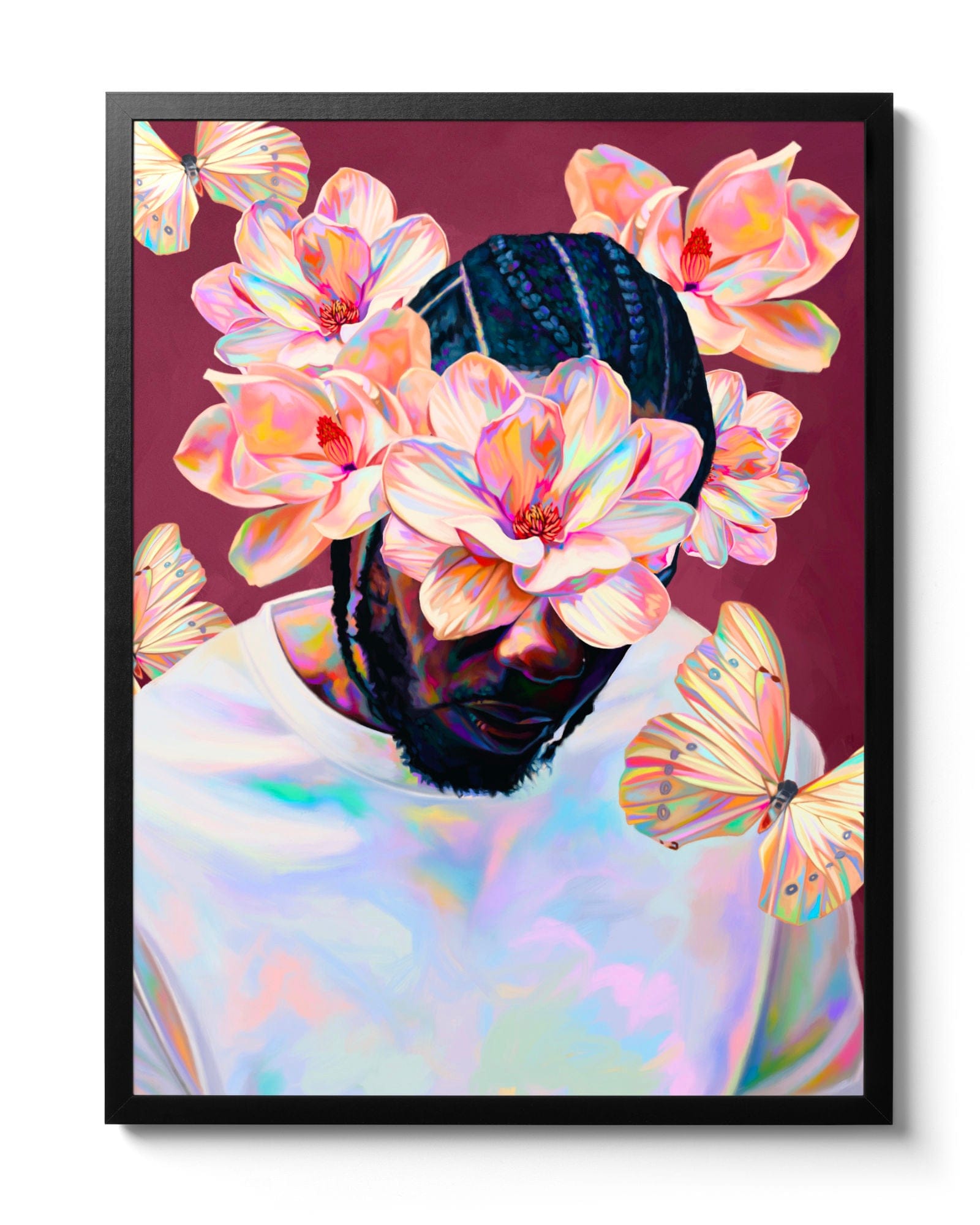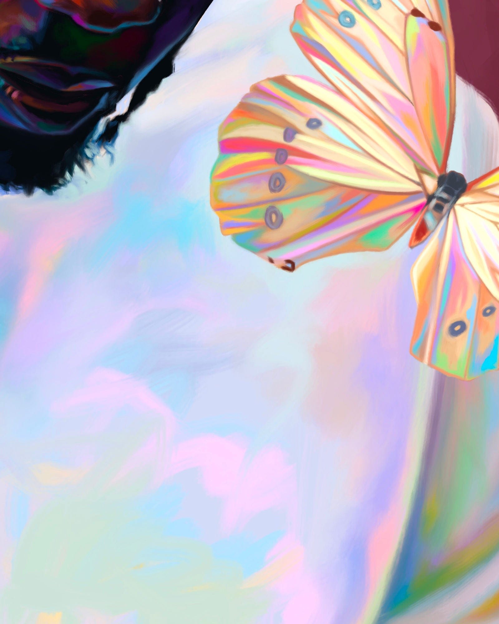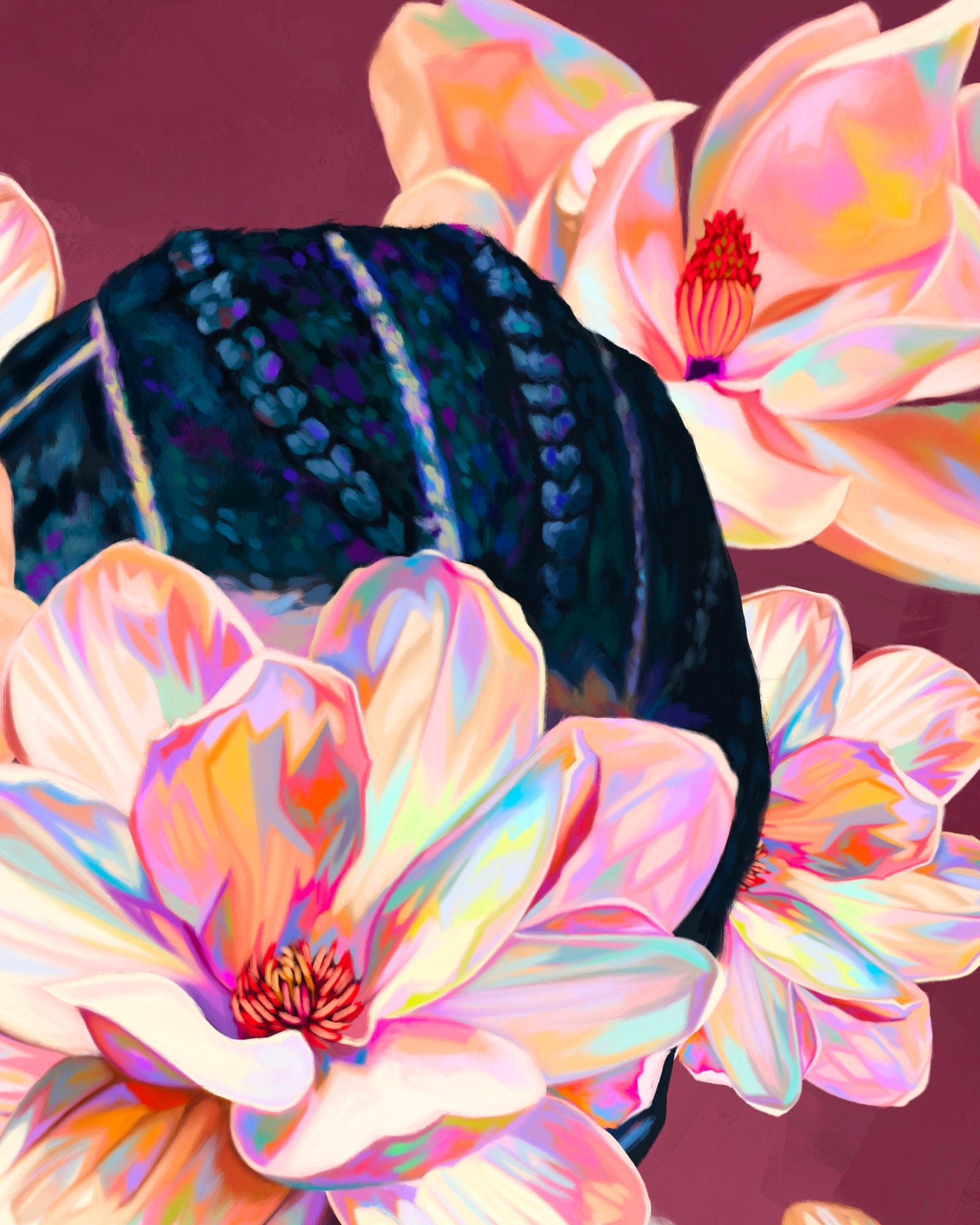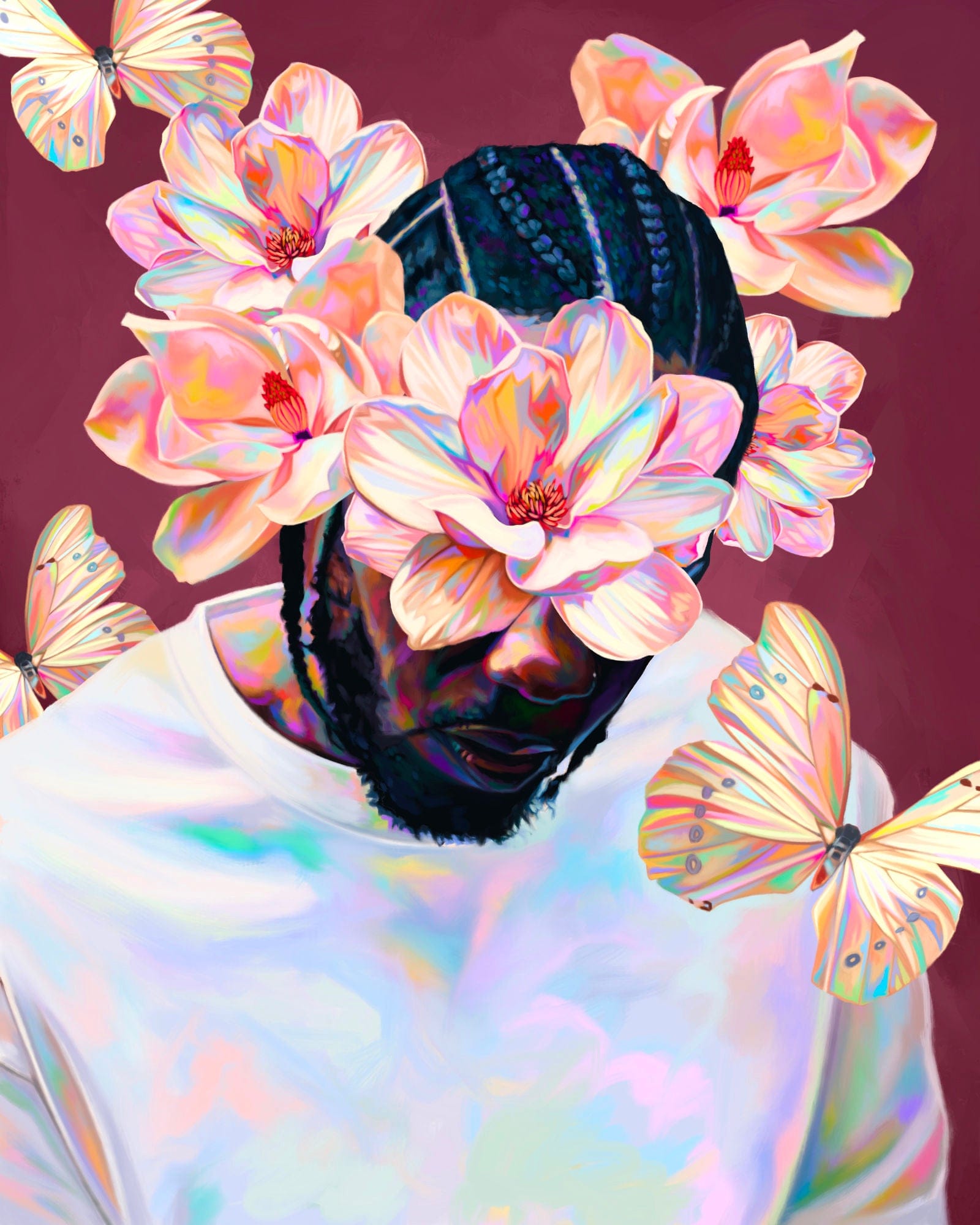 The focus on this piece was to celebrate the original album cover's aesthetic and this one gorgeous magnolia I found felt perfect for that. It became the hero flower in the center and then I found a second one to compliment the first. The butterflies are a nod to To Pimp a Butterfly and were the final touch in resolving the composition. Kendrick's posture, and large white shirt made it difficult to design. But this was an instance where I sketched out how the flow of the foliage could work and then filled it in, as opposed to just placing my reference images in the composition and playing with them. I chose to incorporate more opalescent effects while still respecting the main colour scheme hierarchy.