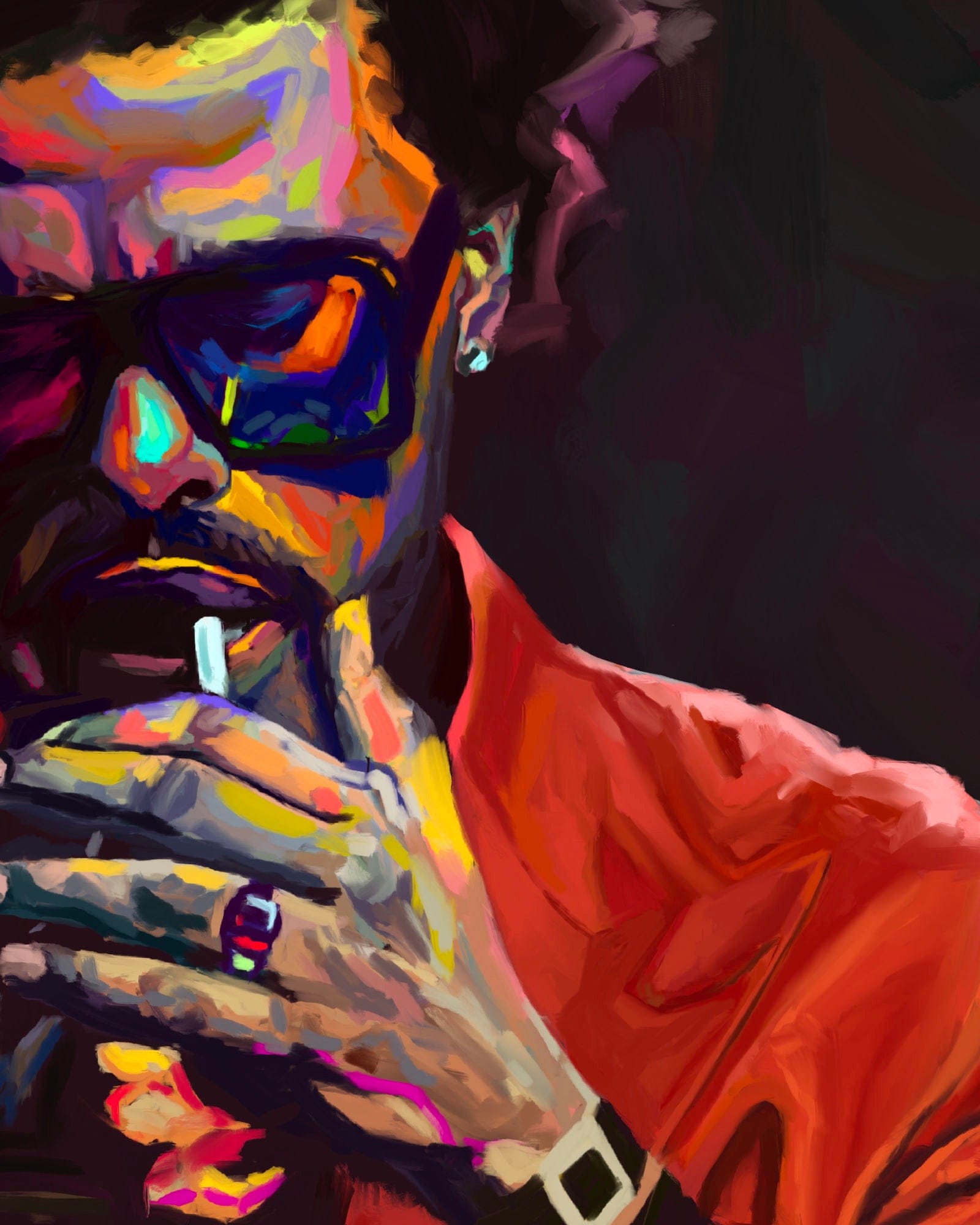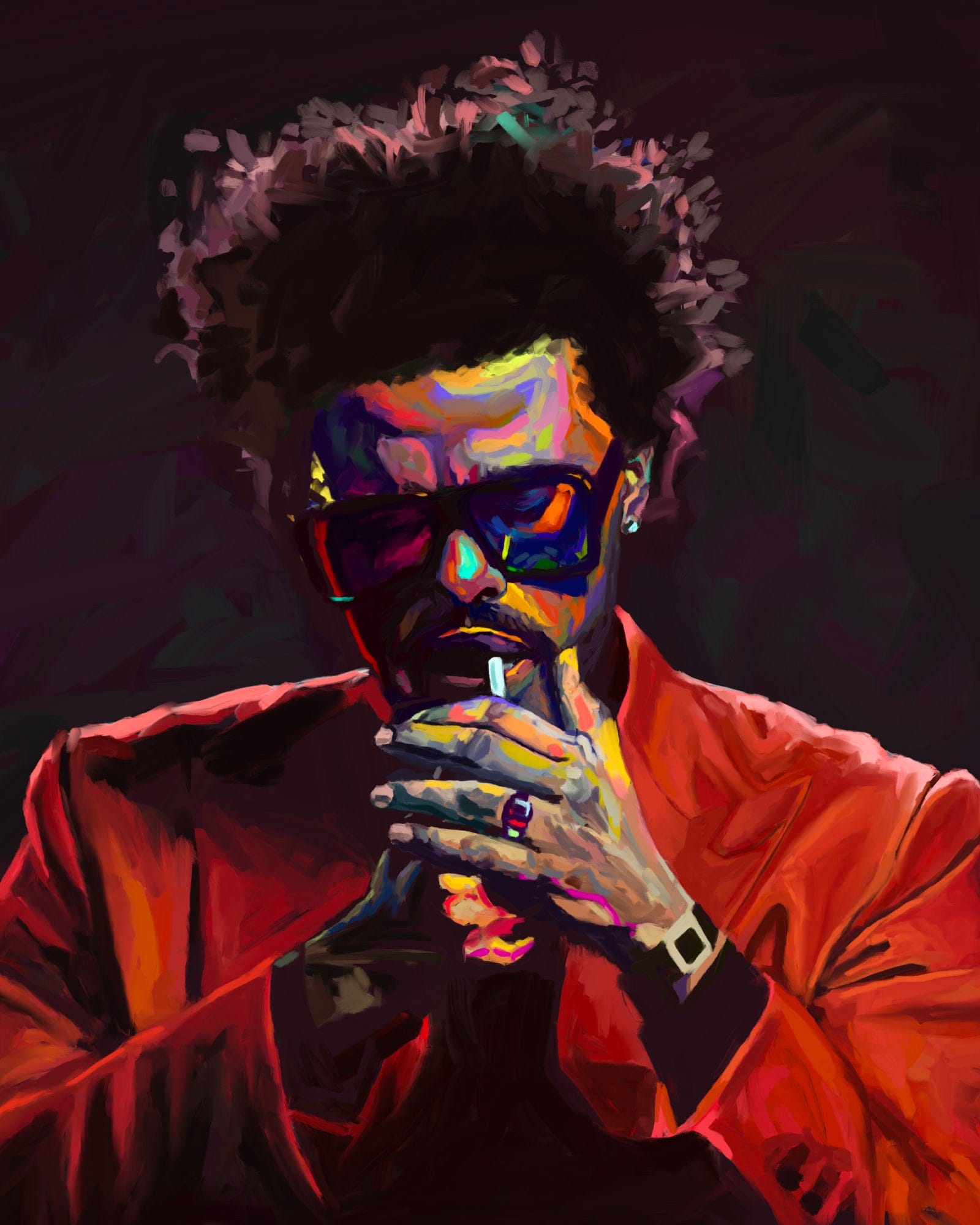 This piece was released just after the After Hours album! It's groovier than his older music with a lot of 80s synths pushing cheerful melodies while he croons his toxic lyrical content with that soulful voice. I'm a huge fan so I had to go super hard on my tribute piece to the project! I incorporated all the elements I liked the most from my various studies and really went for a painterly mood. Although the overall composition is dark, I wanted to add a lot of texture and used the bright saturated moments to echo how his music might look visually.