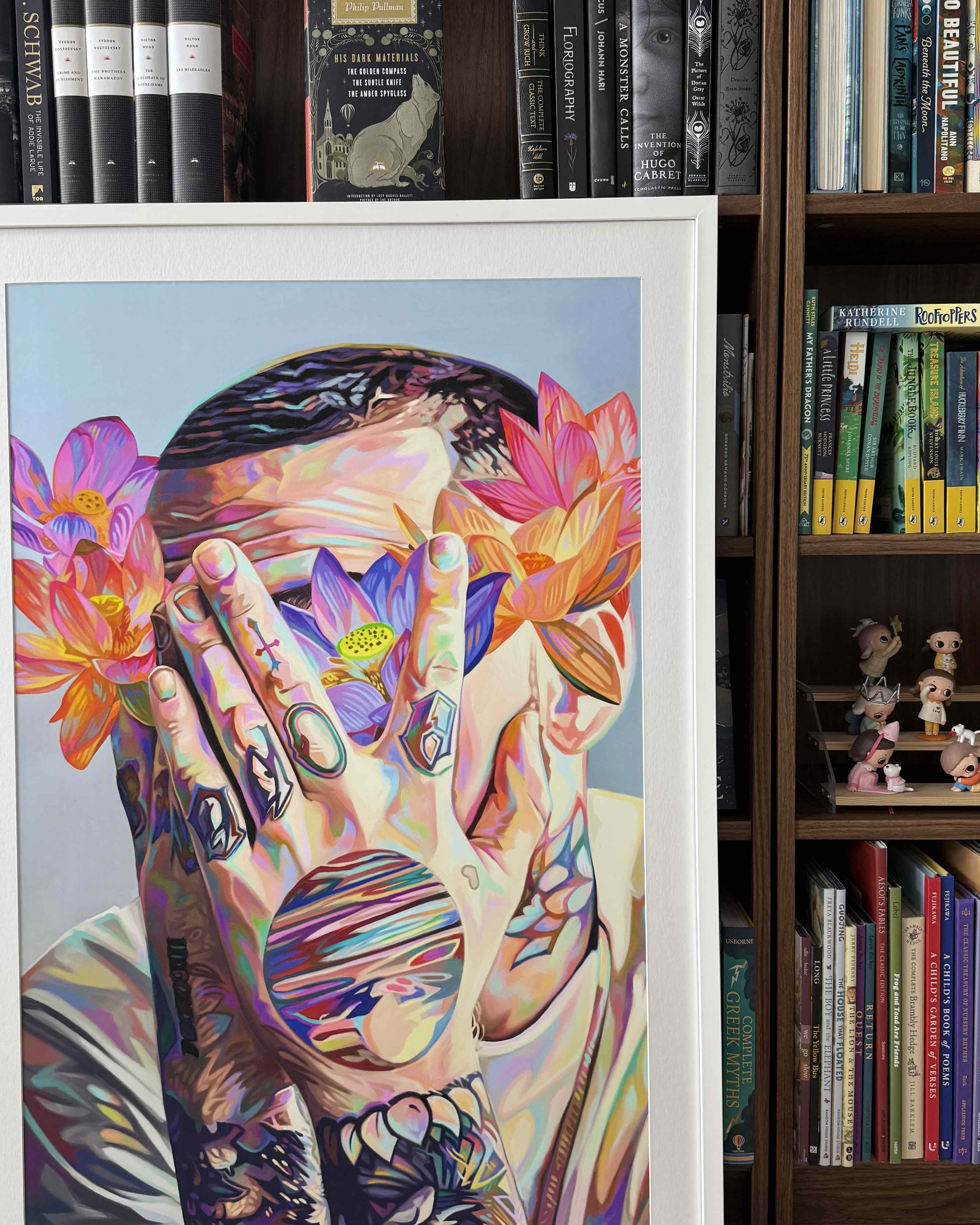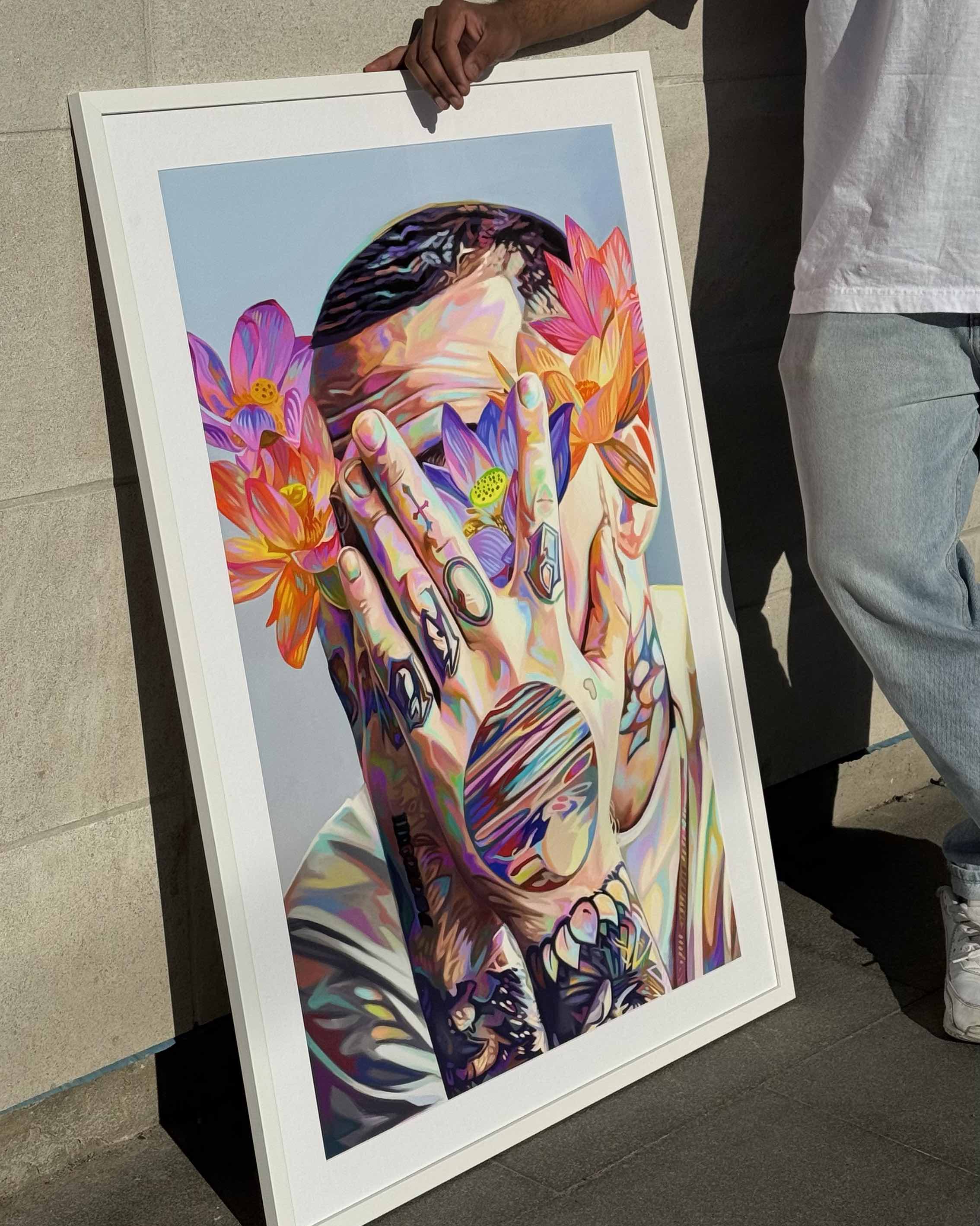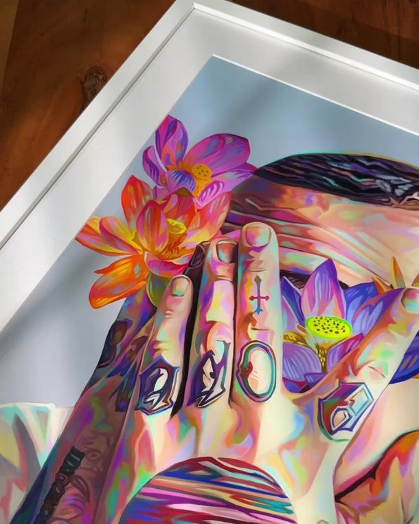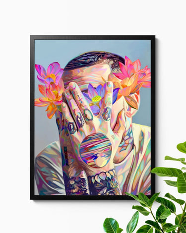 This is my third Mac piece to date. I used lotus flowers since they were Mac's favorite and has one tattooed on his neck which you can see. I wanted a soft palette for the piece, and I wanted to incorporate them into his hand tattoos to create a chromatic twist on an already iconic image. I named this piece after Mac's producer alter ego. It felt fitting since his face was already covered. It feels nice to finally give my boy his flowers.