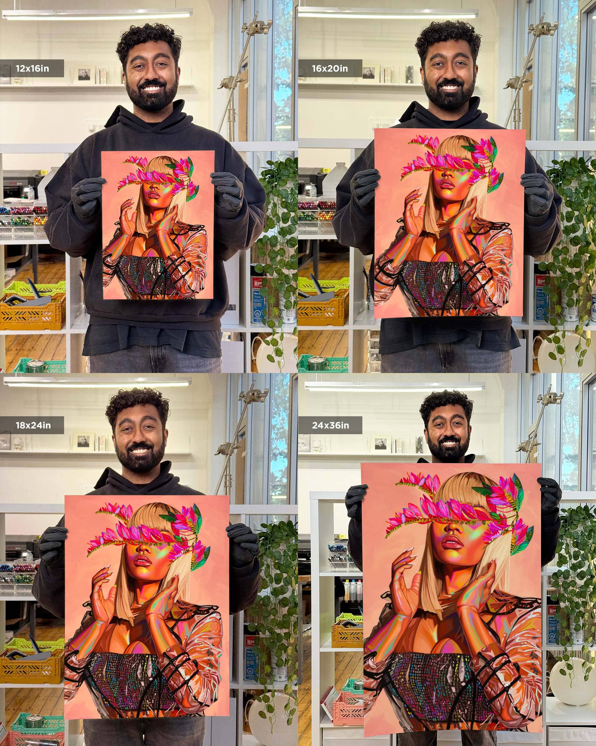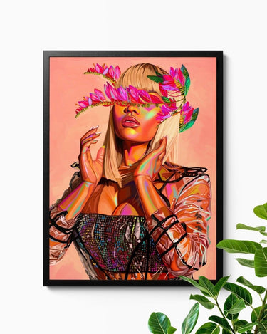 Onika Tanya Maraj, otherwise known as Nicki Minaj is hands down one of the best female rappers of all time. I remember when I first heard of her through my roommate in first year undergrad on Monster and was blown away by her vocal performance and immaculate lyricism. For this piece I used the Chaconia, the national flower of Trinidad to celebrate Minaj's heritage. I was also very focused on pushing the cleanliness of my shape design. Fun fact is even though I paint portraits and flowers, I feel like I identify as an abstract artist and want to make every little moment on the canvas exciting through colour and form. I'm glad to have this one finished because it felt like putting together a puzzle with microscopic shape pieces!