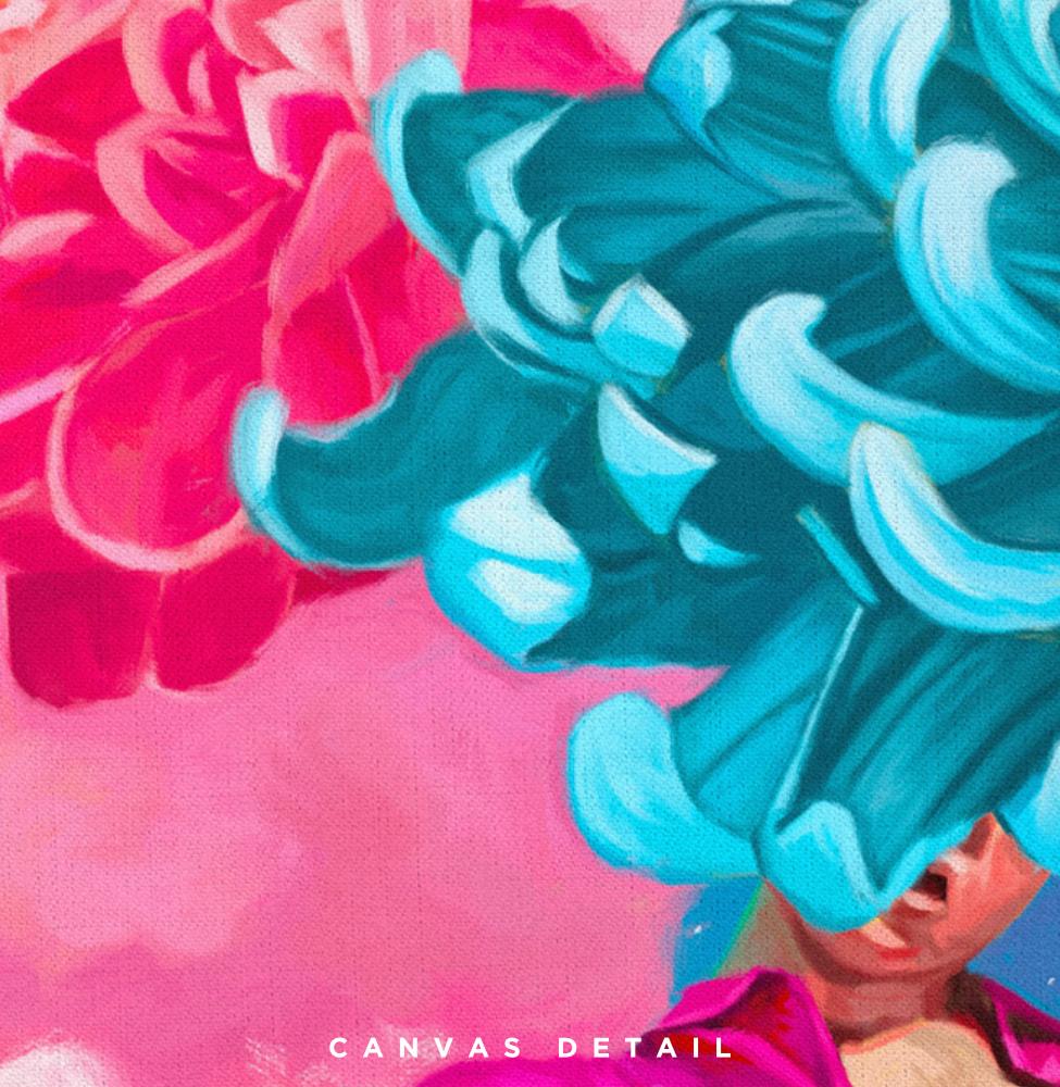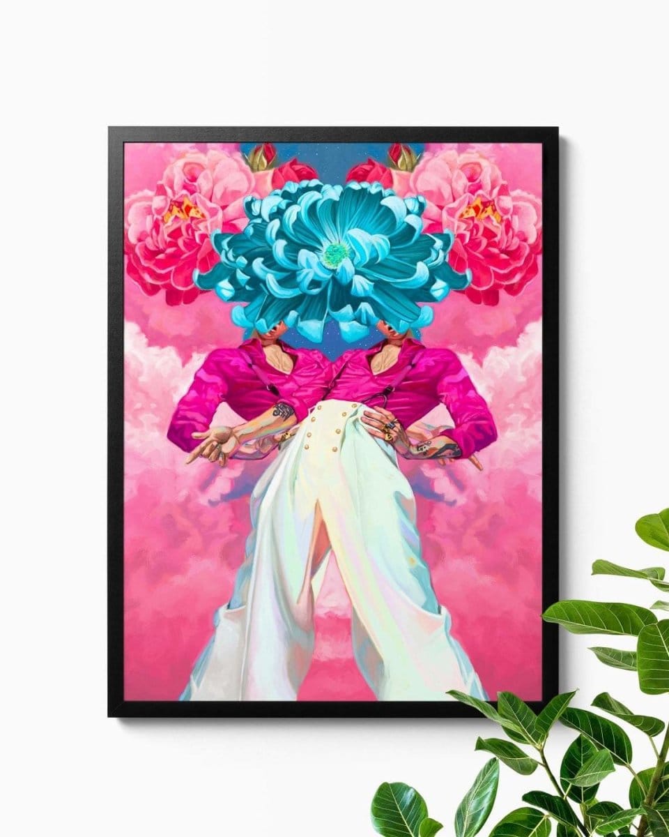 I listened to two of Harry Style’s albums to find inspiration for this piece and was so amazed. I had thoughts of pinks and blues when listening to his music and was very amused to find out that his album cover used this colour scheme. The gallic roses are the token flower of Bromsgrove, his home town, and the chrysanthemum just looked really cool and electric, like his vulnerable rockstar vibes.