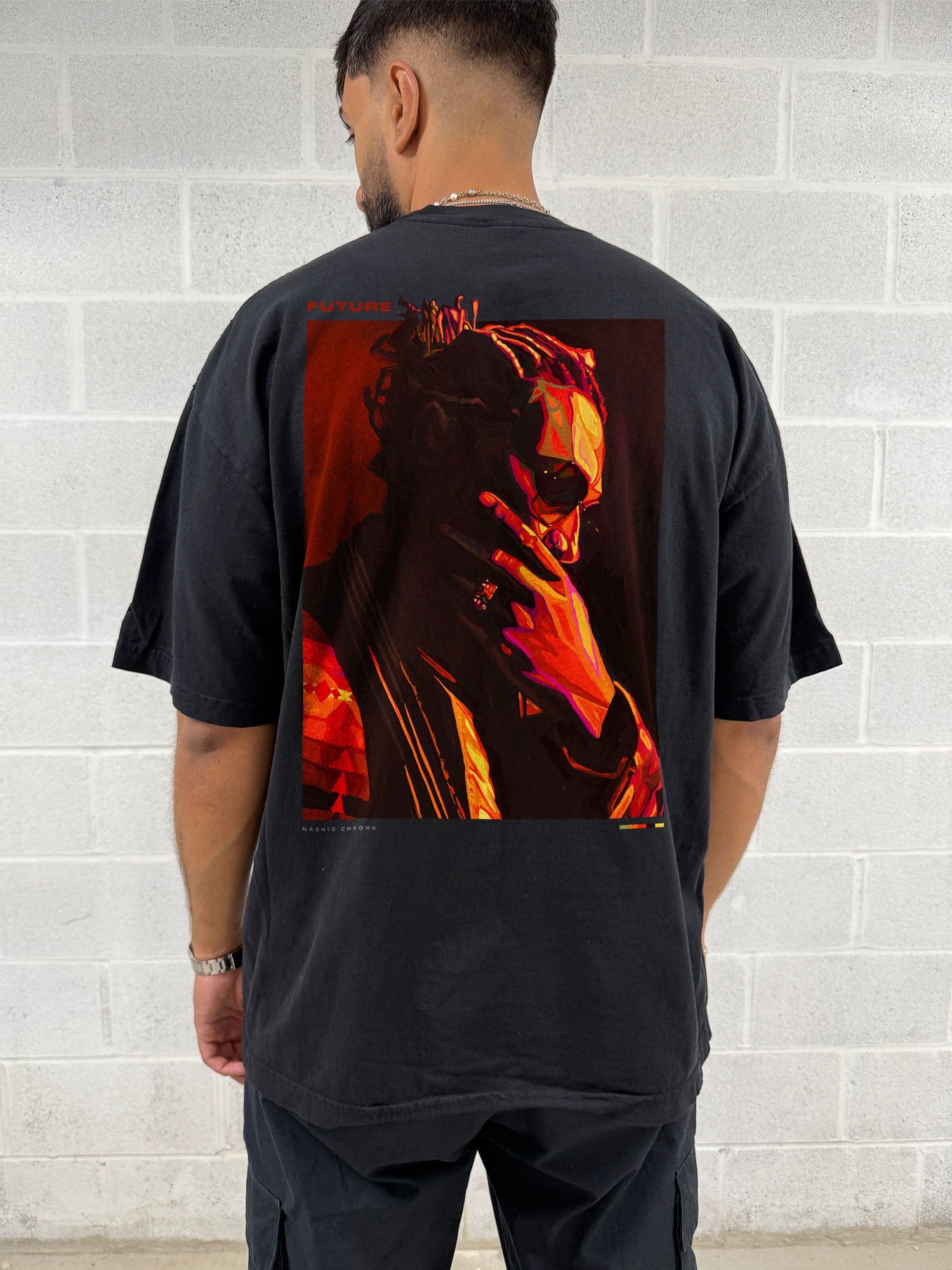 The piece is embellished with a premium silicone Nashid Chroma logo on the front, and an oversized print on the back. The size makes for an impressive statement piece in contrast to the clean tee.