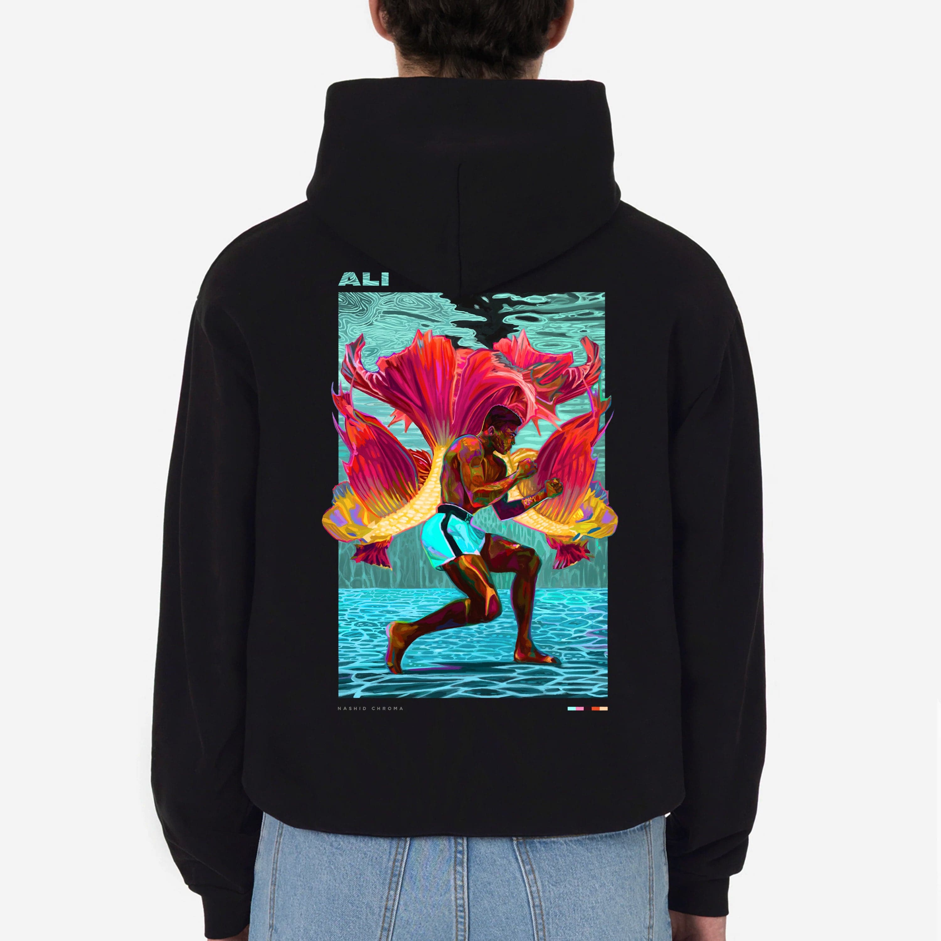 The piece is embellished with a premium silicone Nashid Chroma logo on the front, and an oversized print on the back. The size makes for an impressive statement piece in contrast to the crisp black cotton.