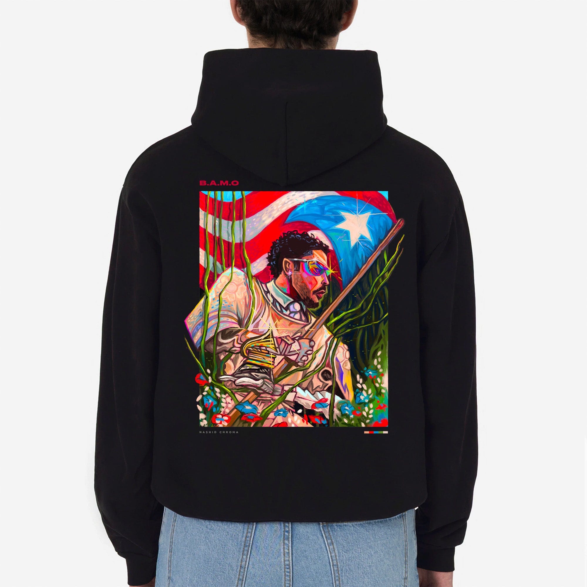 The piece is embellished with a premium silicone Nashid Chroma logo on the front, and an oversized print on the back. The size makes for an impressive statement piece in contrast to the crisp black cotton.