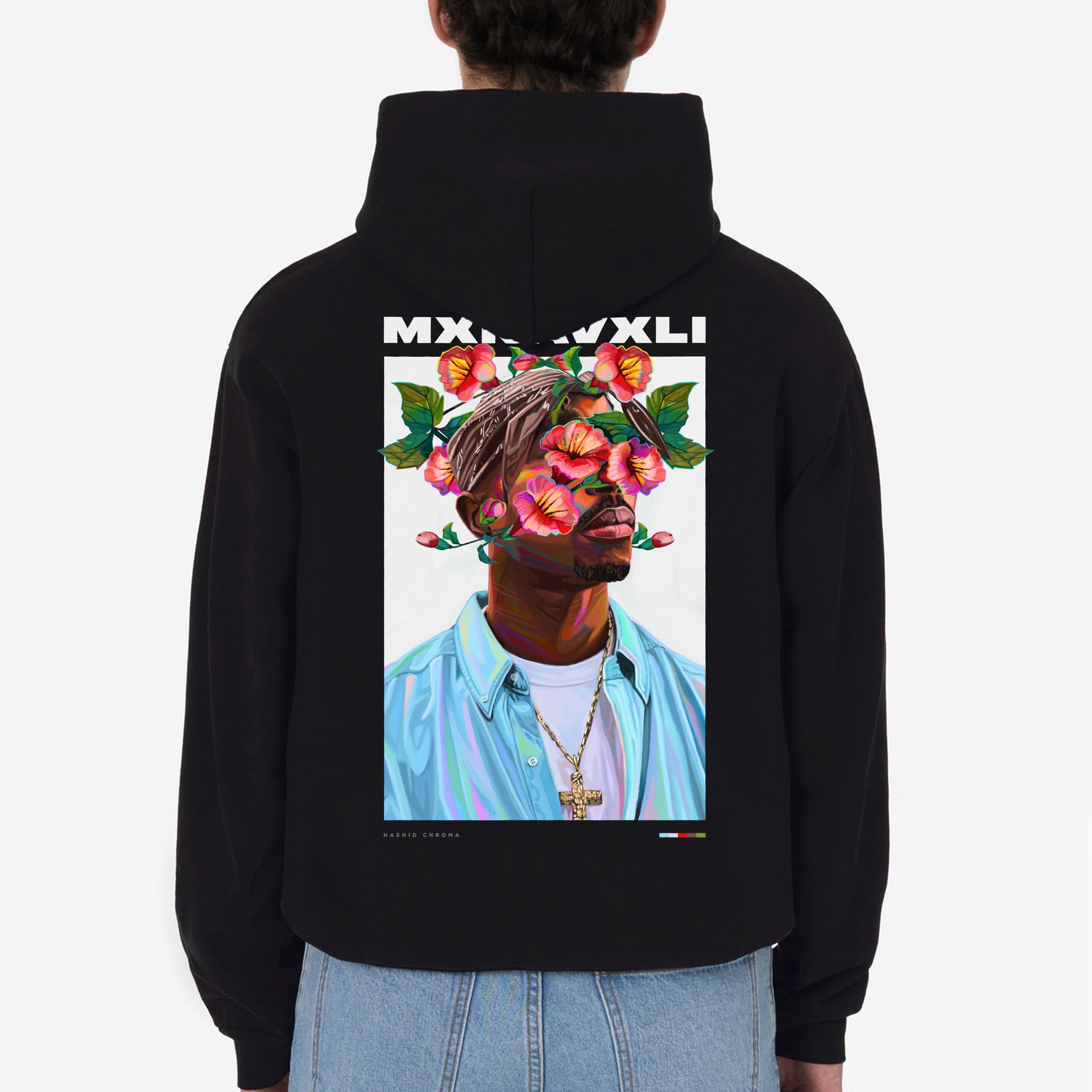 The piece is embellished with a premium silicone Nashid Chroma logo on the front, and an oversized print on the back. The size makes for an impressive statement piece in contrast to the crisp black cotton.