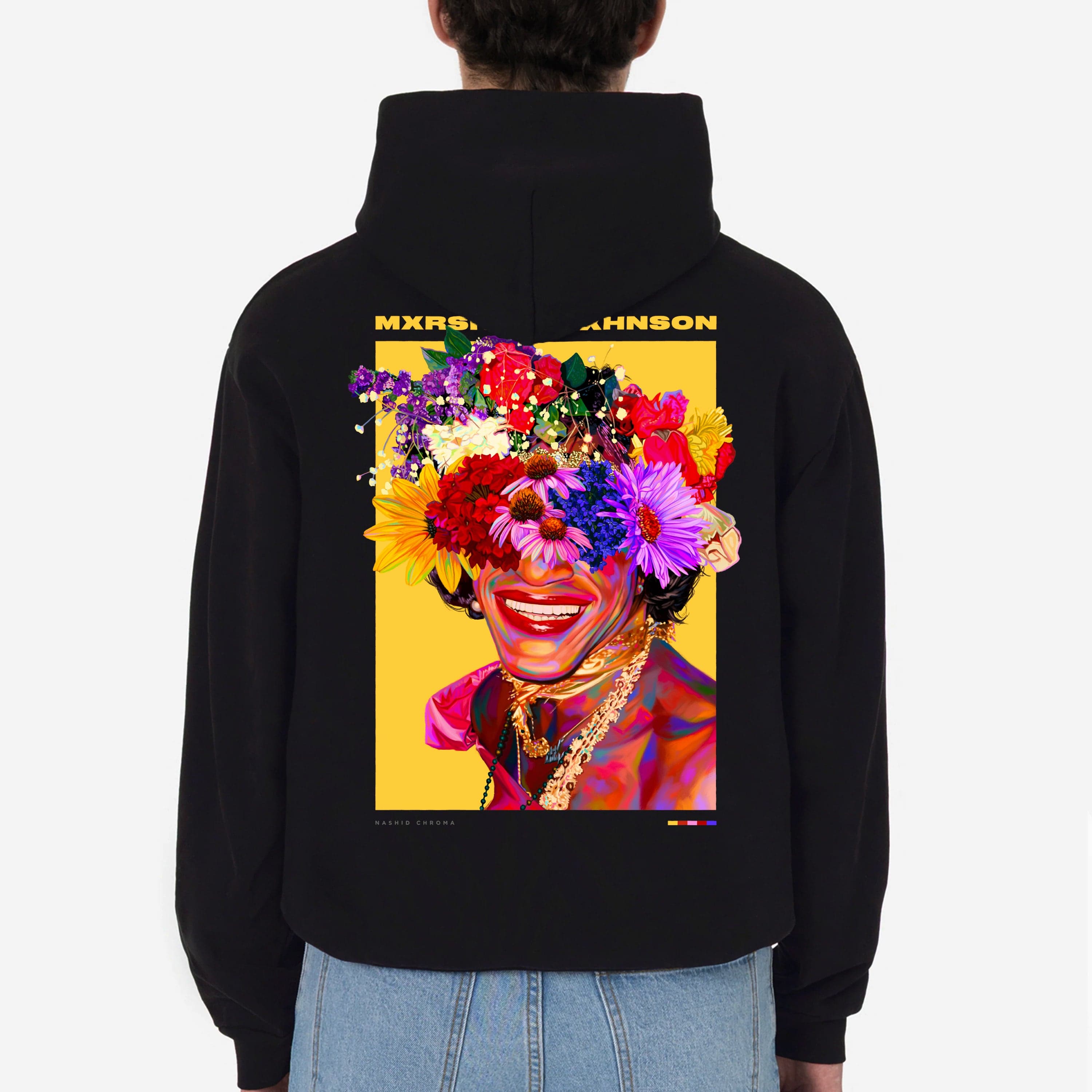 The piece is embellished with a premium silicone Nashid Chroma logo on the front, and an oversized print on the back. The size makes for an impressive statement piece in contrast to the crisp black cotton.