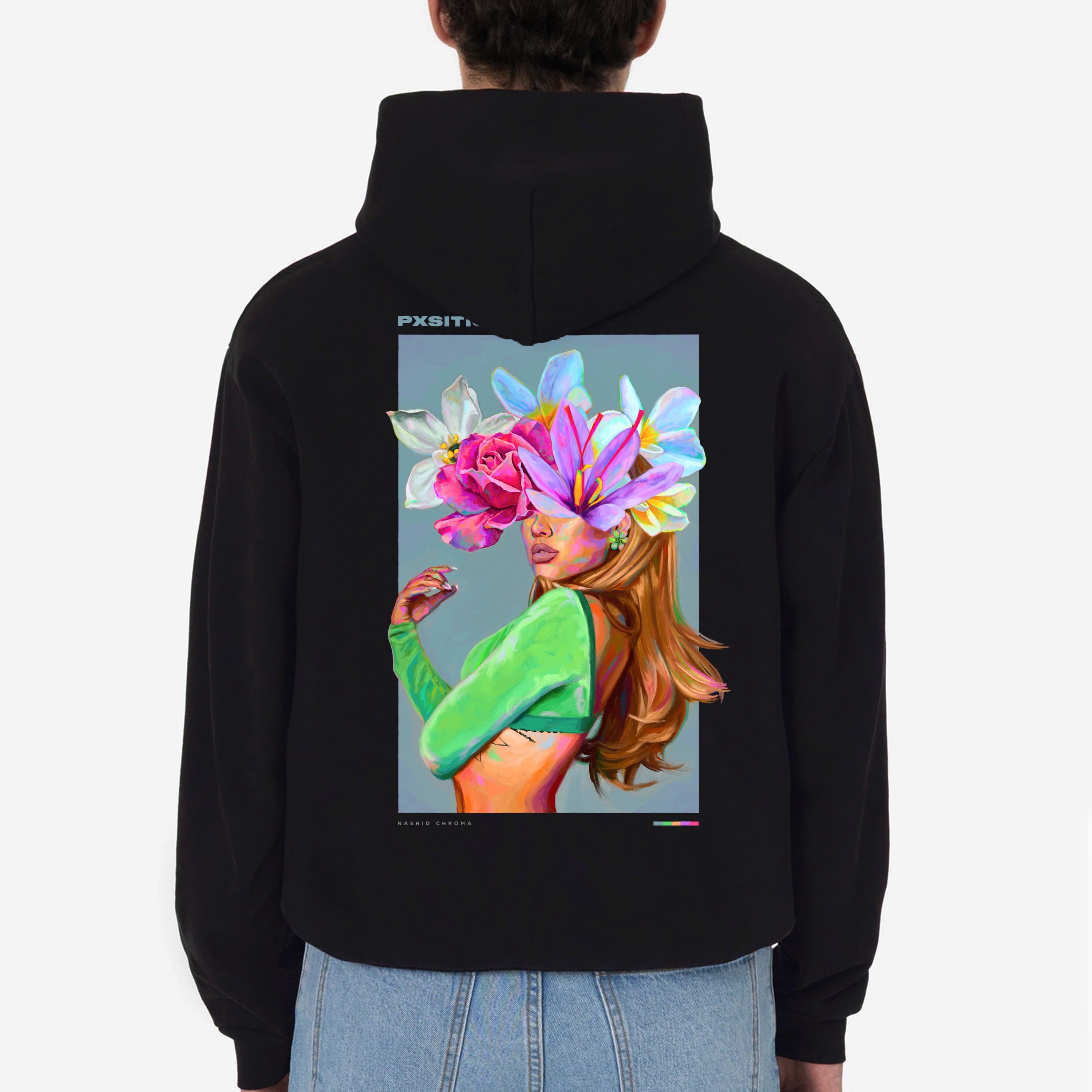 The piece is embellished with a premium silicone Nashid Chroma logo on the front, and an oversized print on the back. The size makes for an impressive statement piece in contrast to the crisp black cotton.