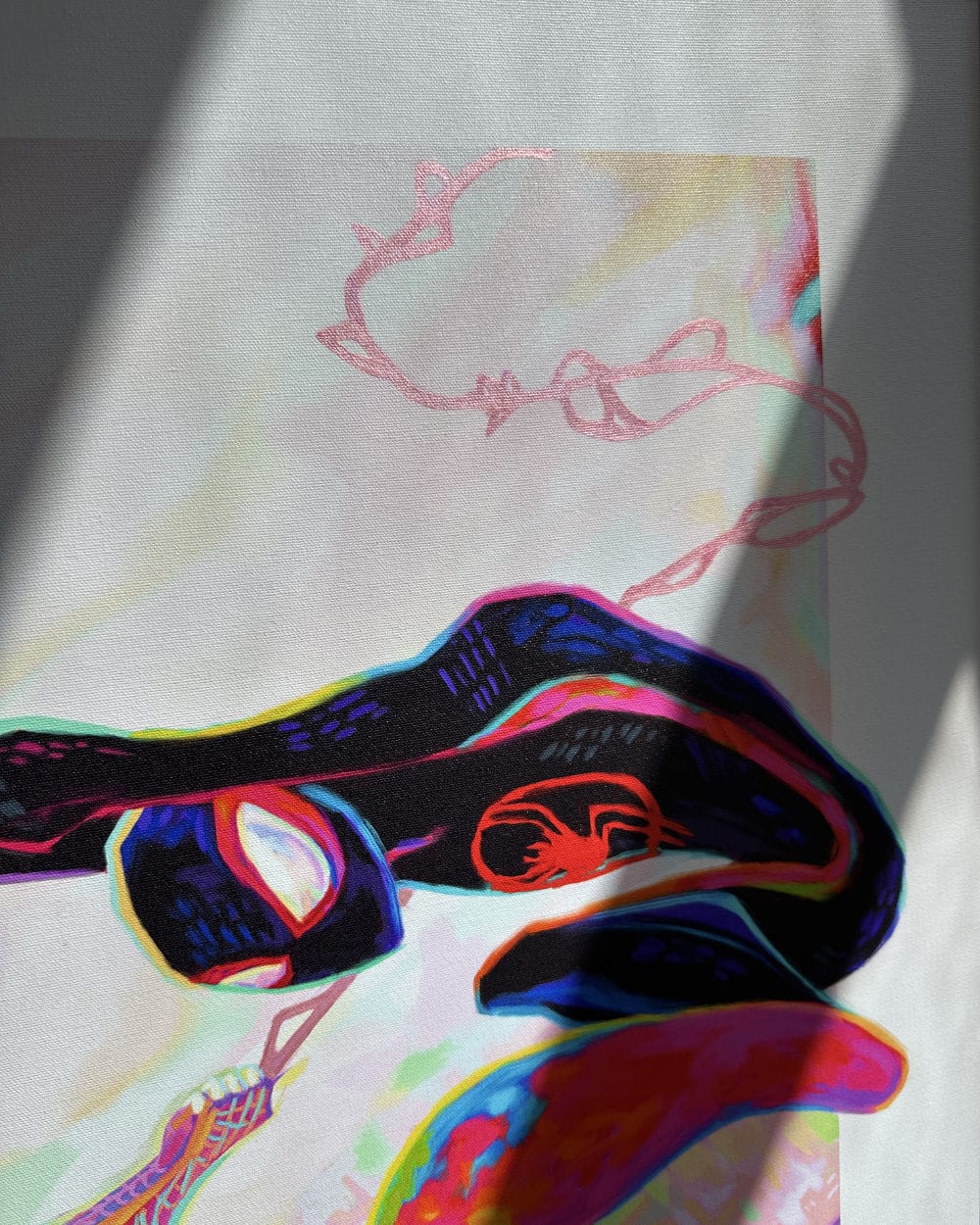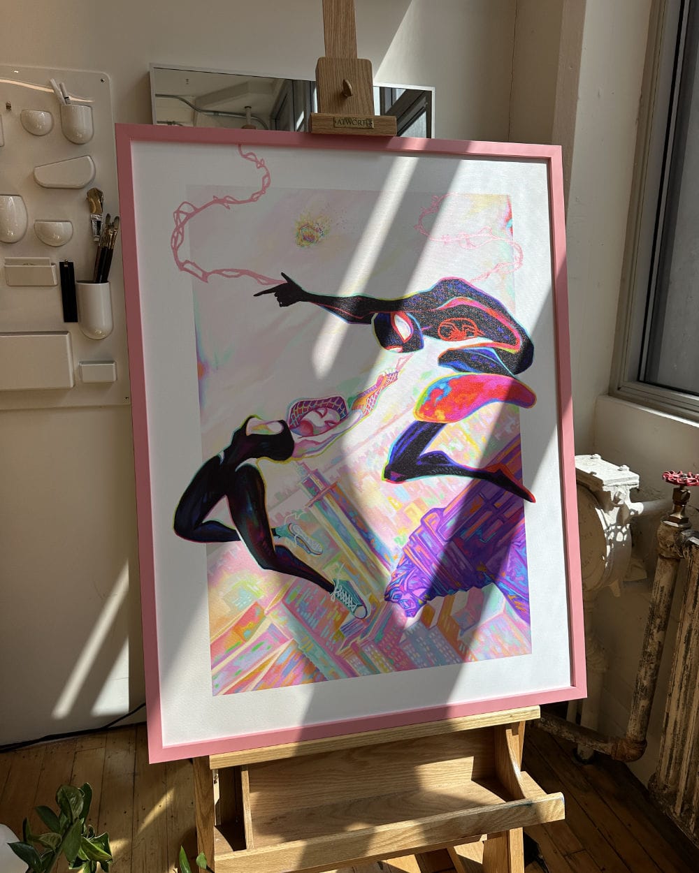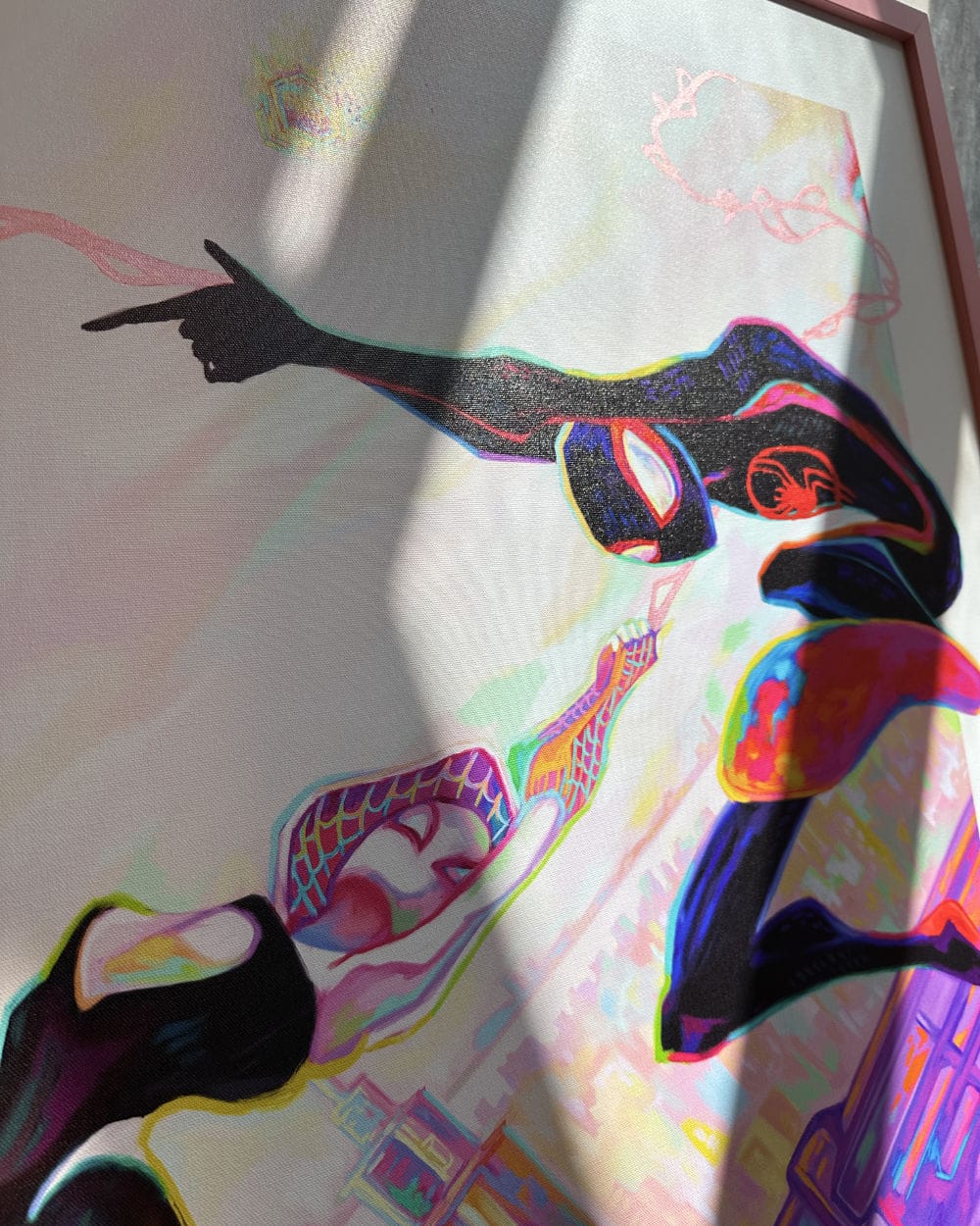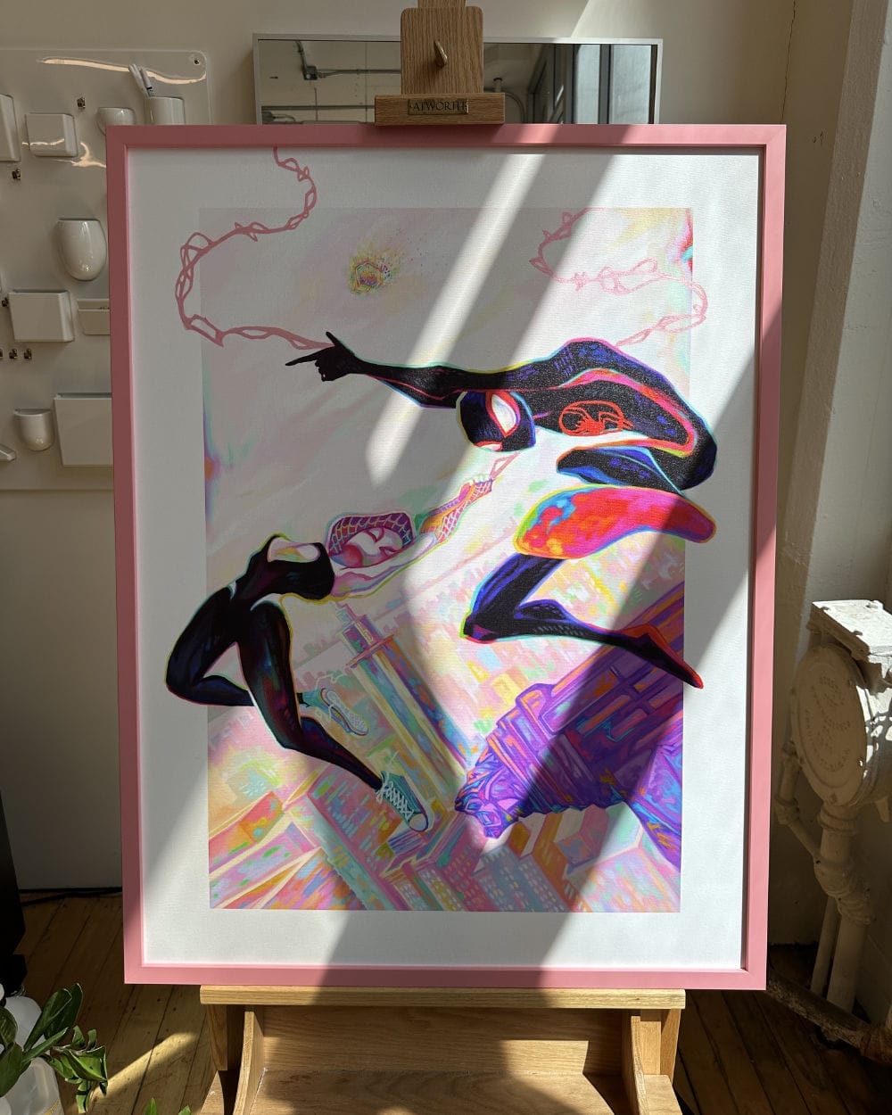 This is the grand version of the limited edition print run I did a couple years ago. This one is still embellished by hand but is printed on canvas and at a show-stopping 30x40in. It is also framed in an electric prink frame. Only 3 editions exist, and I'm excited for them to find their new home 🕸️🤍
