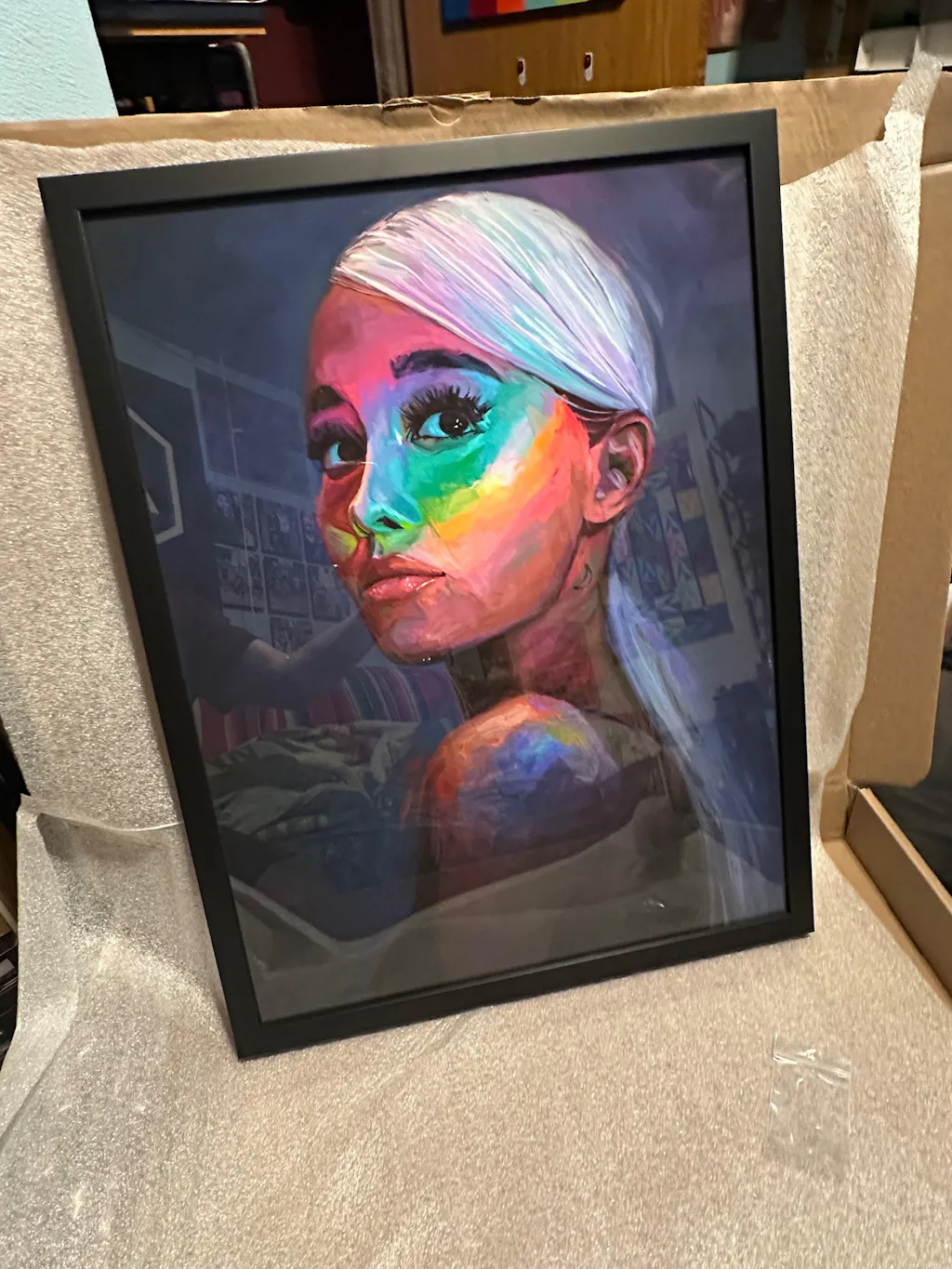 Artwork and packaging was delivered damaged. Poor shipping method that doesn’t protect the artwork well enough. Art looks great. But I don’t think it’s worth the risk, or the price.