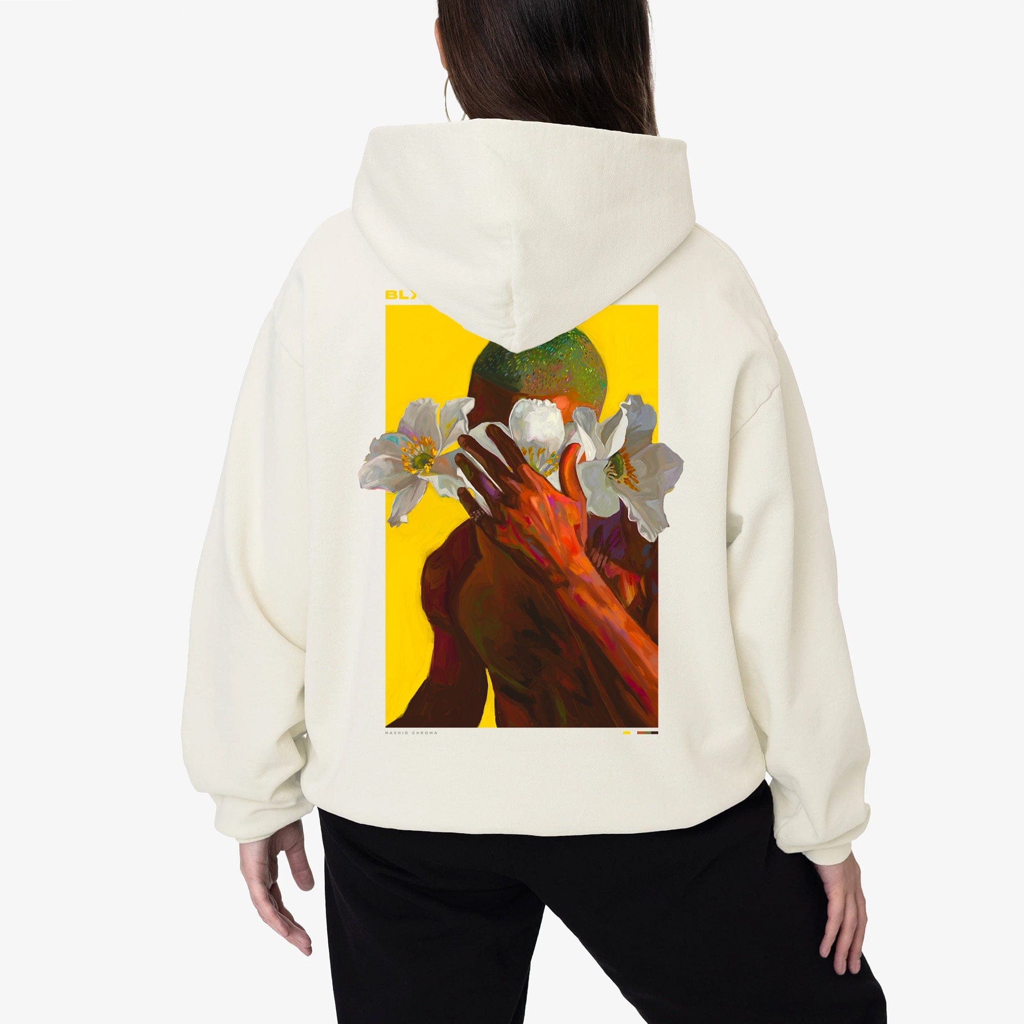 The piece is embellished with a premium silicone Nashid Chroma logo on the front, and an oversized print on the back. The size makes for an impressive statement piece in contrast to the crisp black cotton.