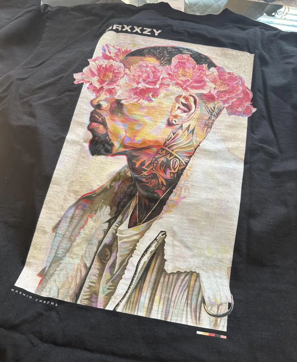 The piece is embellished with a premium silicone Nashid Chroma logo on the front, and an oversized print on the back. The size makes for an impressive statement piece in contrast to the clean tee.