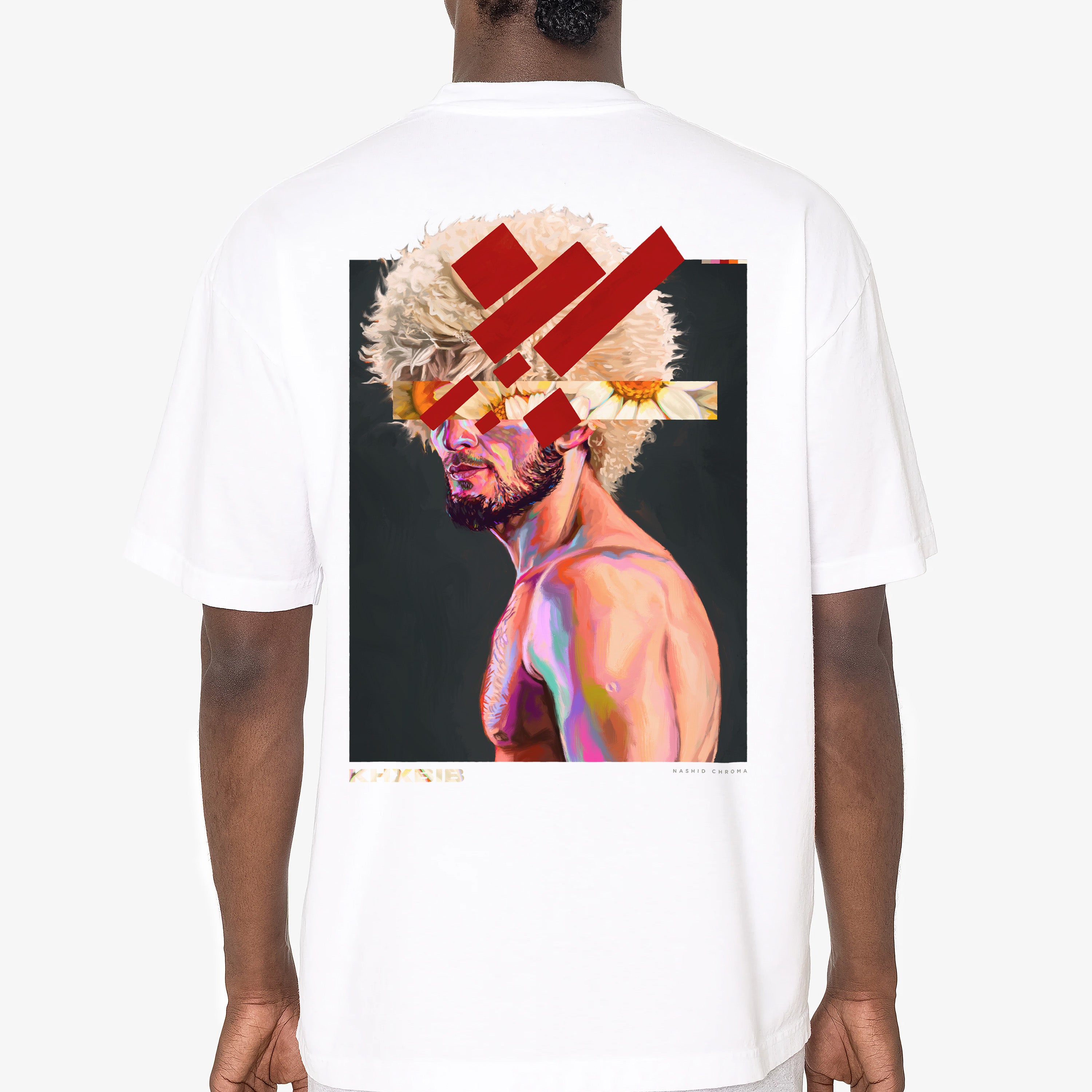 The piece is embellished with a premium silicone Nashid Chroma logo on the front, and an oversized "borderless" print of KHXBIB on the back. The size makes for an impressive statement piece in contrast to clean tee.