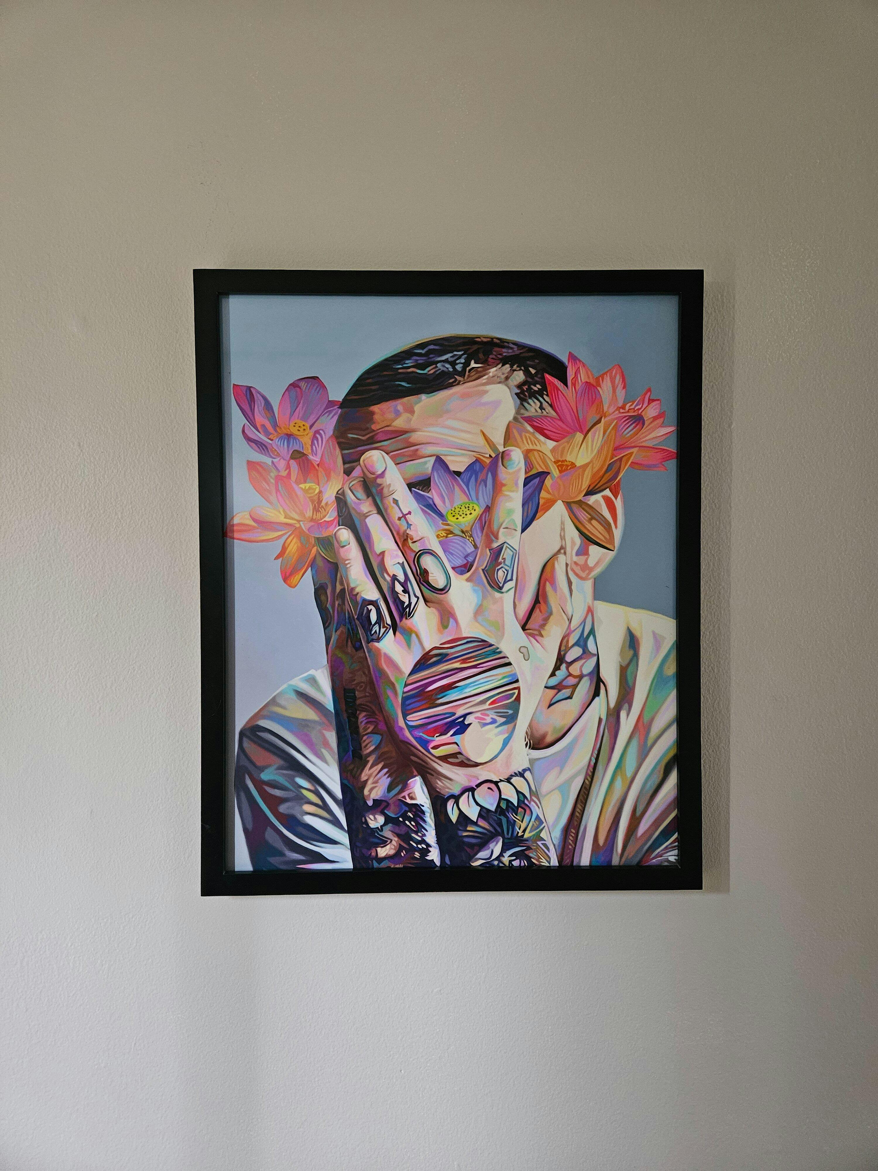 This is my third Mac piece to date. I used lotus flowers since they were Mac's favorite and has one tattooed on his neck which you can see. I wanted a soft palette for the piece, and I wanted to incorporate them into his hand tattoos to create a chromatic twist on an already iconic image. I named this piece after Mac's producer alter ego. It felt fitting since his face was already covered. It feels nice to finally give my boy his flowers.