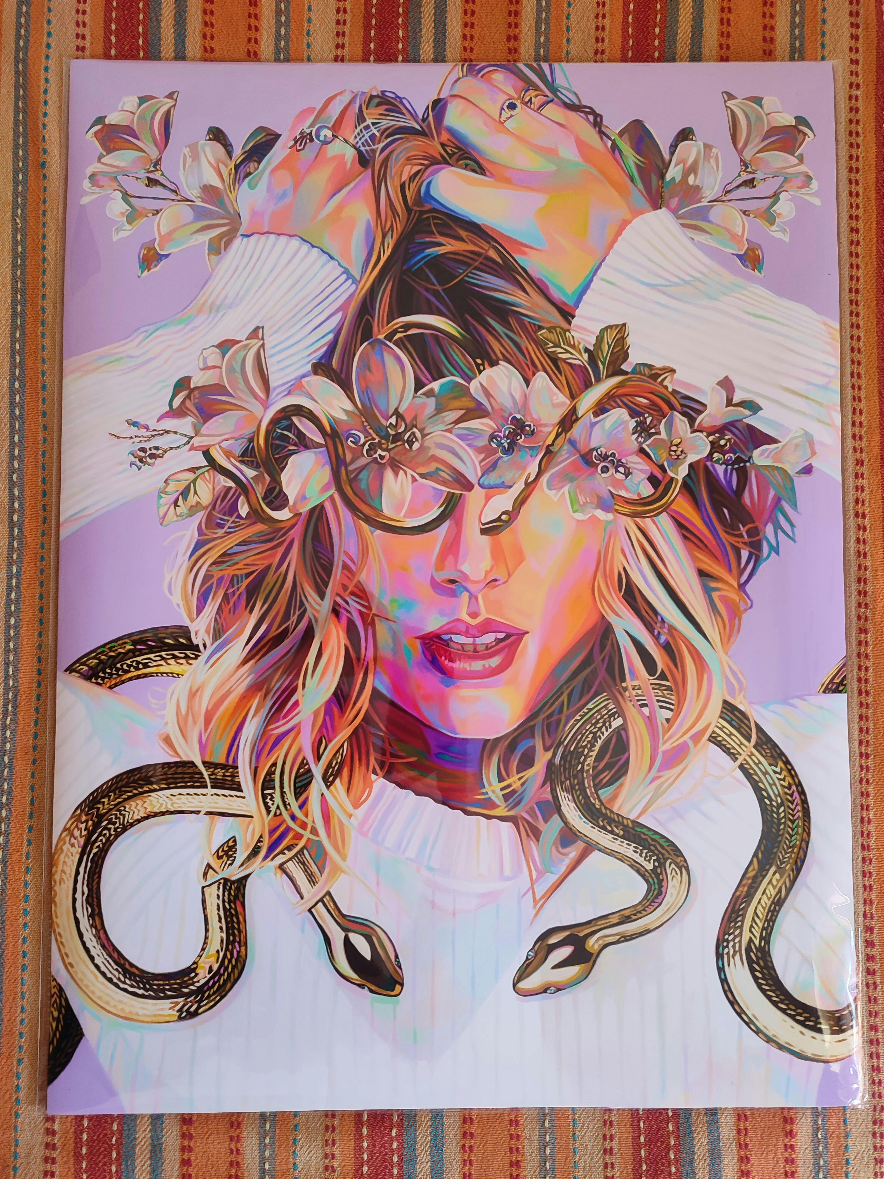 I felt super inspired by the snakes in the set design of the Reputation Tour. Technically, this was one of the most challenging paintings l've done to date! I wanted to paint golden snakes to capture a royal air but wasn't anticipating how ambitious of an undertaking that would be. The total paint time clocked in at almost 40h because of how intricate the design was.